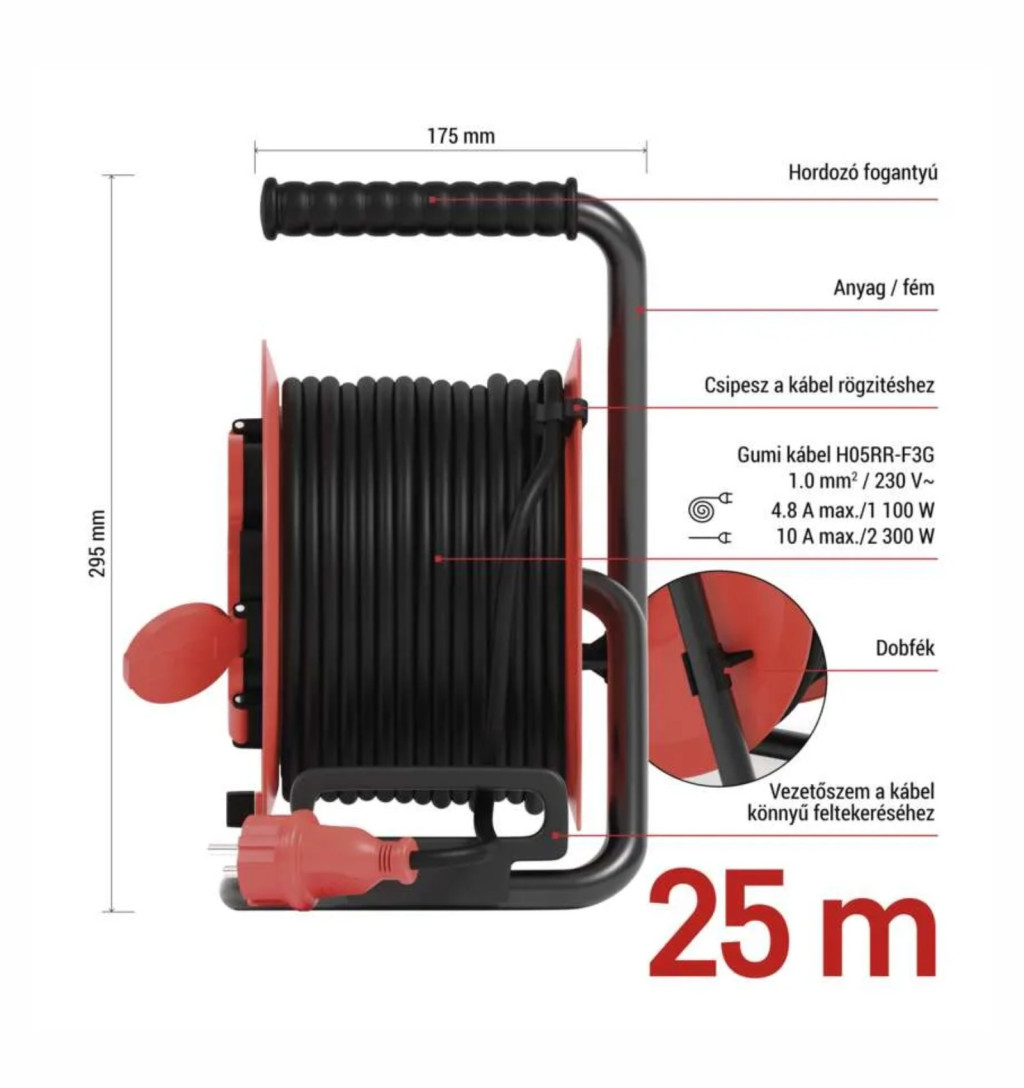 A kábeldob hőkioldó biztosítékkal rendelkezik, amely túlterhelés esetén automatikusan megszakítja az áramellátást, így védve az elektromos berendezéseket. A dob reteszelőféke biztosítja a stabil pozíciót használat közben.