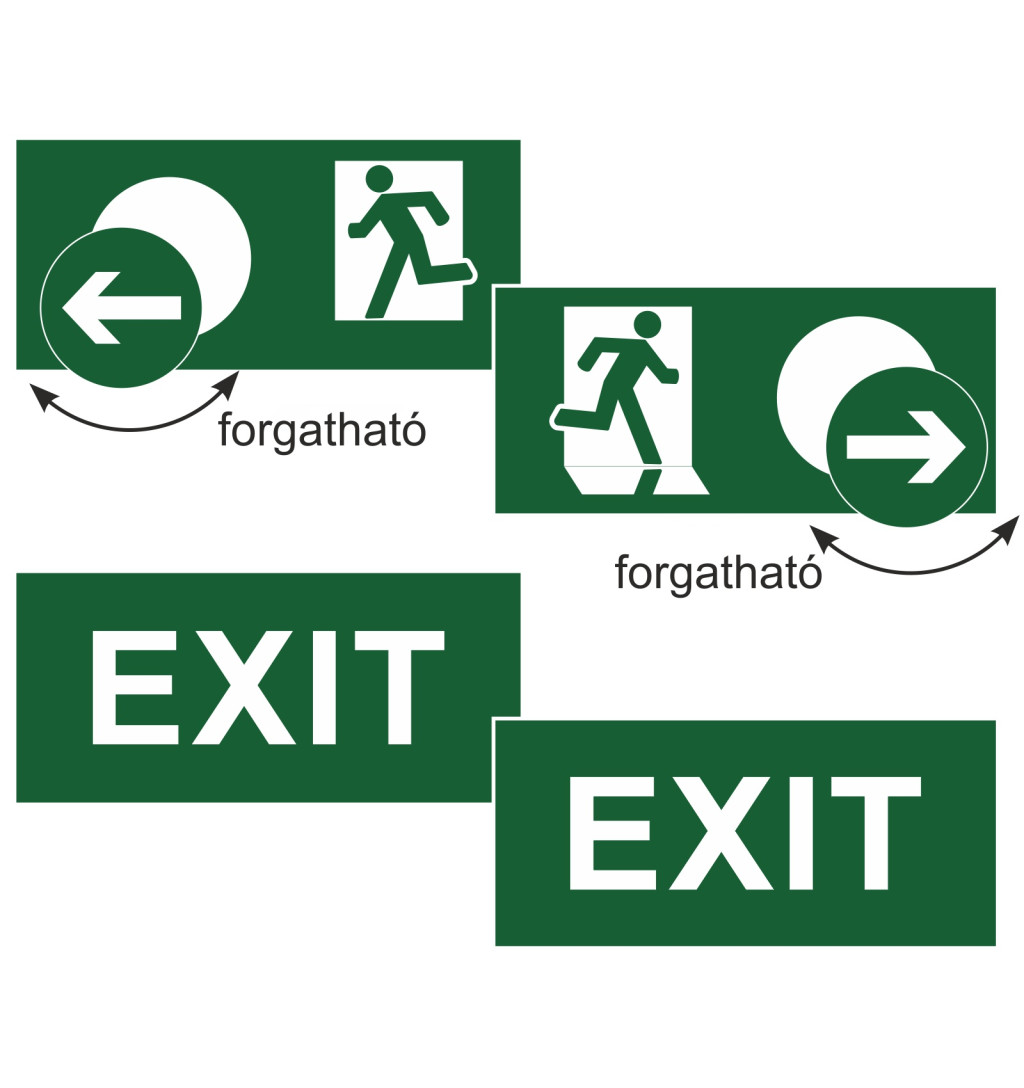 - Matricák: 4 db (2× EXIT, 2× nyíl, forgatható)
