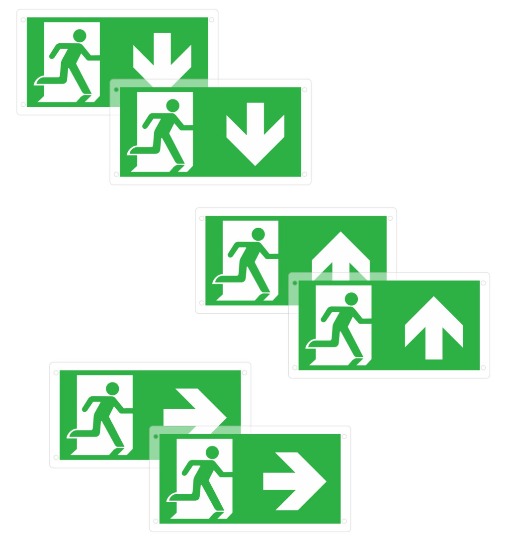 - Kiegészítők: cserélhető menekülési útirányt jelző táblák