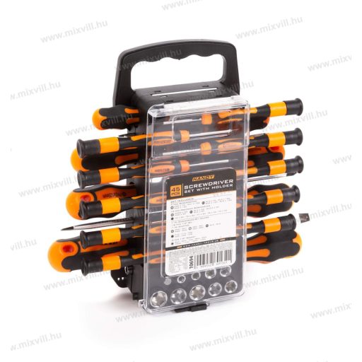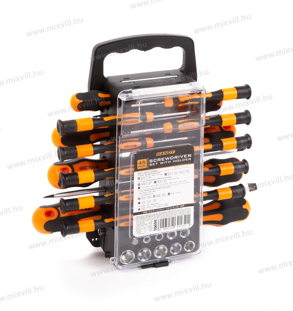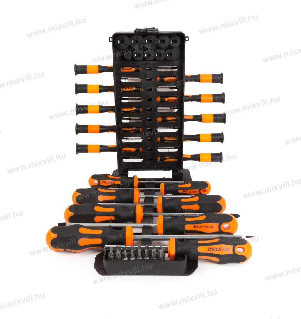 A Handy csavarhúzó készletével könnyedén és gyorsan dolgozhat. A szárak nagy szilárdságú CR-V anyagból készültek, így ellenállnak a kopásnak. Az ergonomikus, csúszásgátló anyagból készült nyél, kényelmes és biztonságos munkavégzést garantál. A kinyitható tárolónak köszönhetően mindig jól áttekinthetőek a szerszámai. Felül találja a preciziós csavarhúzókat és a krova fejeket, az alsó szinten pedig a nagyobb méretű csavarhúzókat és a bitfejeket.