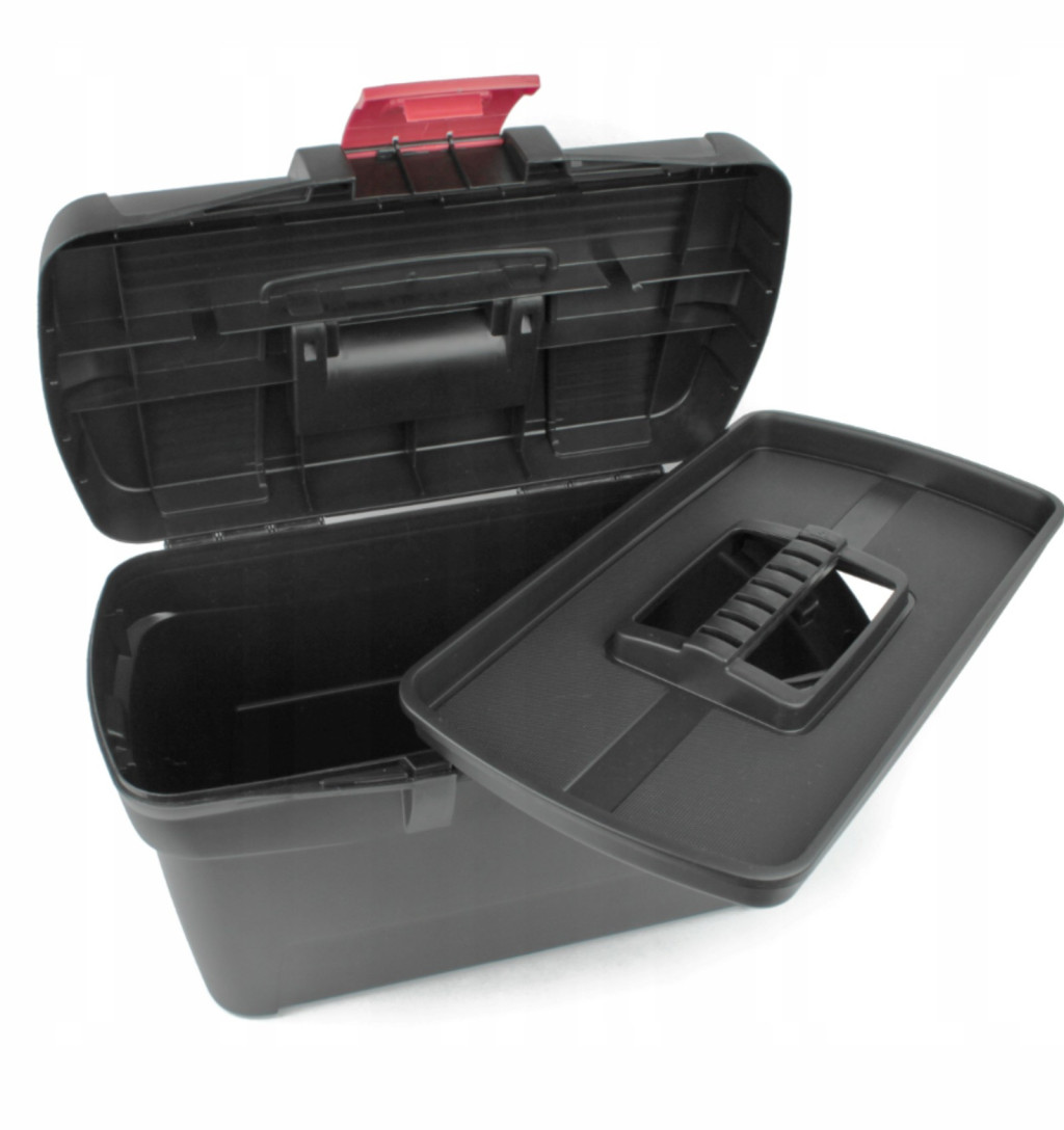 Ez a leírás egy szerszámosládára vagy egy hordozható tárolóeszközre utalhat, amely a következő tulajdonságokkal rendelkezik: