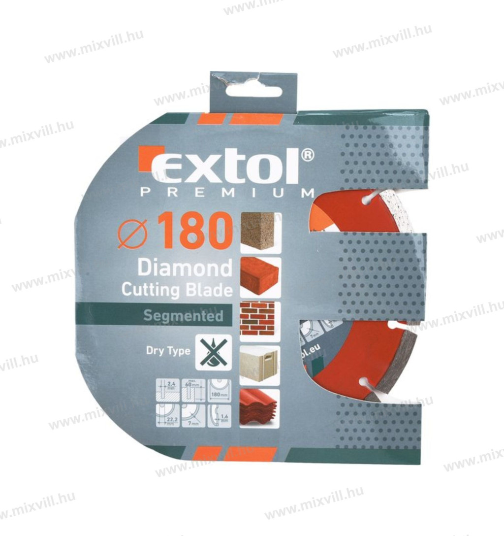A gyémántvágó korongok nagy teljesítményű szerszámok melyek alkalmazásuk során nagy génybevételnek vannak kitéve. Az Extol Prémium gyémántvágó korongok megbízható, általános felhasználású vágószerszámok, melyek megfelelő biztonságot garantálnak Önnek a munkavégzés során A gyémántvágó korongot beton, tégla, cserép, téglafal, kő, gránit vágásra lehet használni. A megfelelő használatát a termék melletti tájékoztatóban olvashatja.