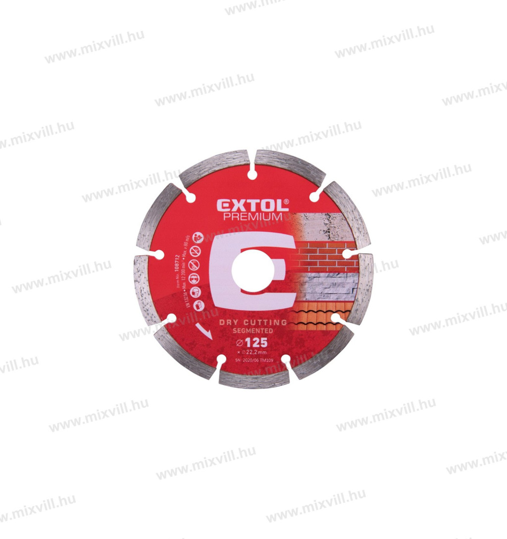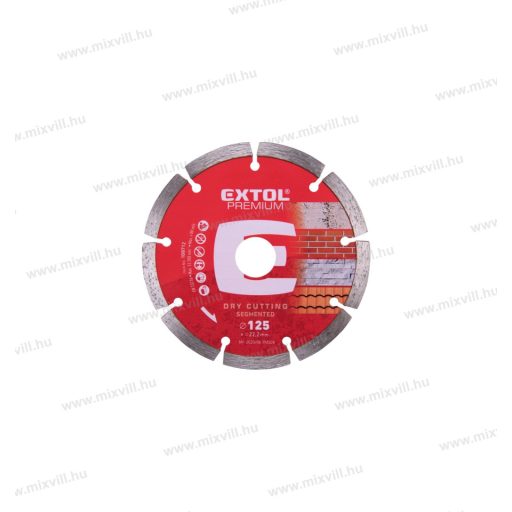 A gyémántvágó korongok nagy teljesítményű szerszámok melyek alkalmazásuk során nagy génybevételnek vannak kitéve. Az Extol Prémium gyémántvágó korongok megbízható, általános felhasználású vágószerszámok, melyek megfelelő biztonságot garantálnak Önnek a munkavégzés során A gyémántvágó korongot beton, tégla, cserép, téglafal, kő, gránit vágásra lehet használni. A megfelelő használatát a termék melletti tájékoztatóban olvashatja.