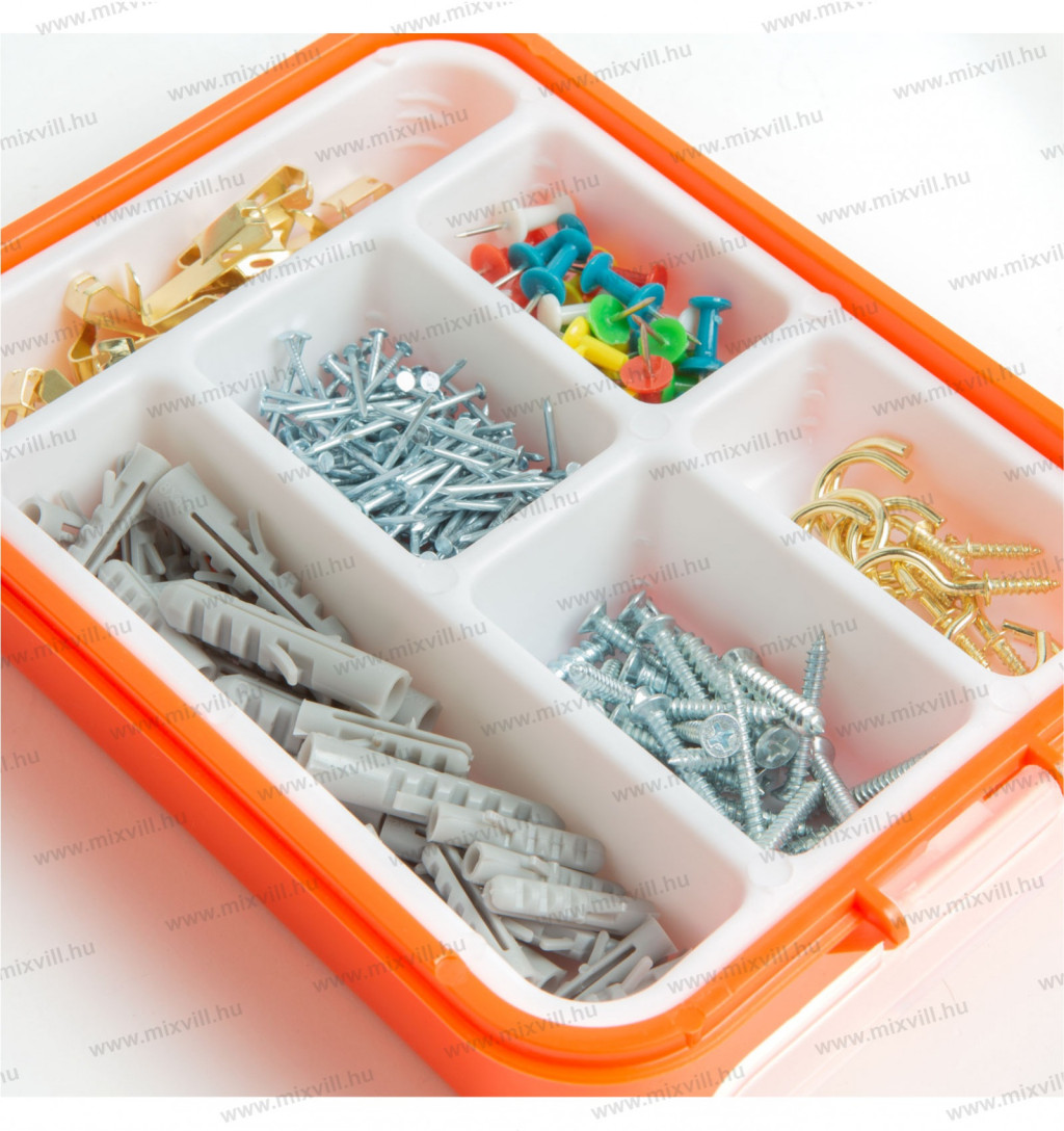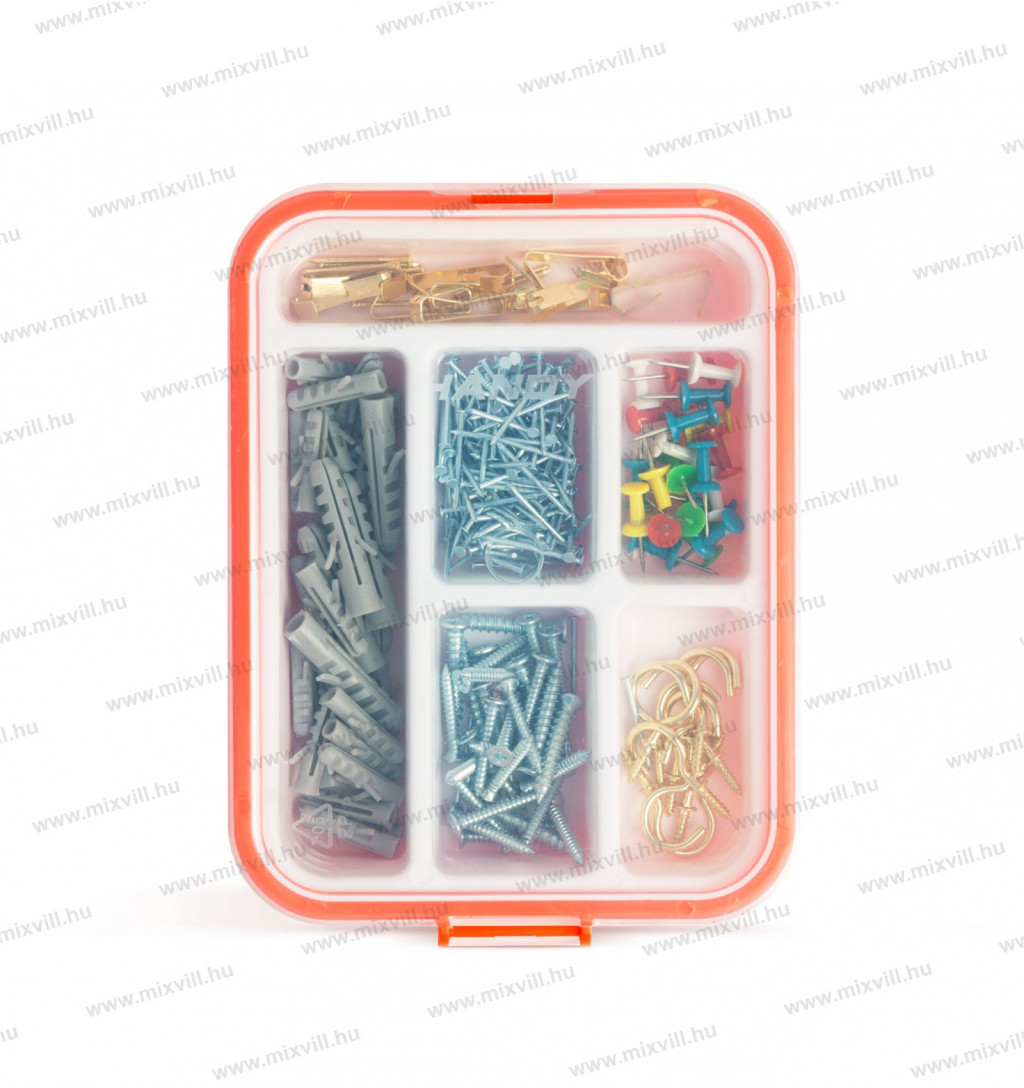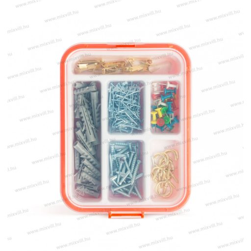 Minden háztartásban szükség van általános barkács termékekre. Ez a készlet a rögzítési folyamat elengedhetetlen kellékeit tartalmazza, többek között tiplik, csavarok, kampók, szegek, térképtűk képezik az átlátszó tetejű doboz beltartalmát.