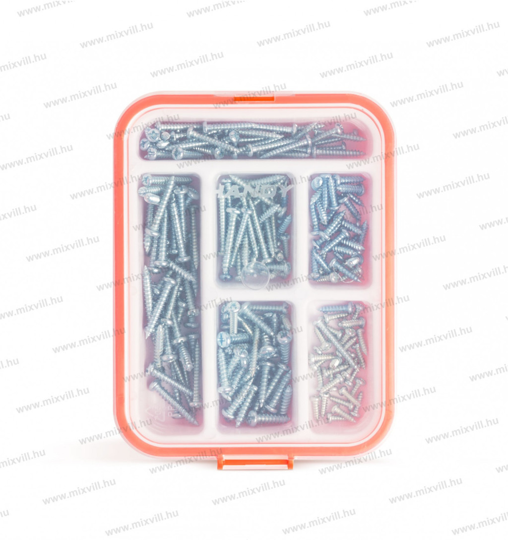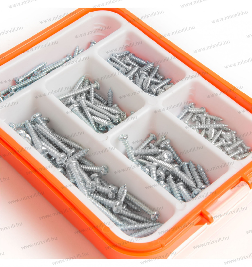 Horganyzott felületű acél csavarok különböző méretben egy szettben. Bármely háztartási barkácsoláskor szükséges kellék lehet a csavar. Az önmetsző menetnek köszönhetően nincs szükség előfúrásra, így a rögzítési folyamat egyszerűen és gyorsan elvégezhető! A praktikus átlátszó doboztető nagyfokú áttekinthetőséget biztosít.