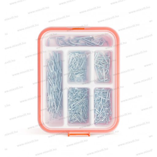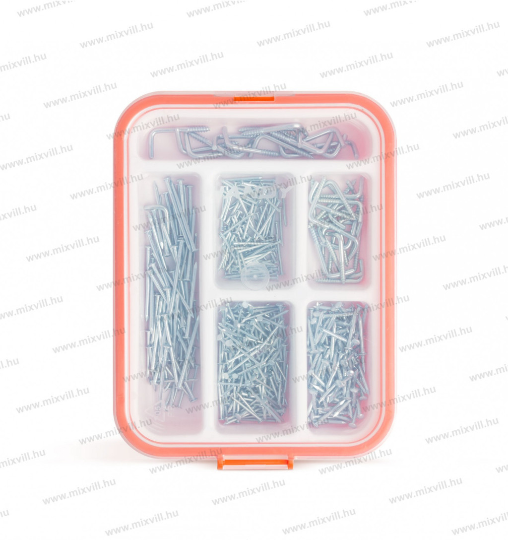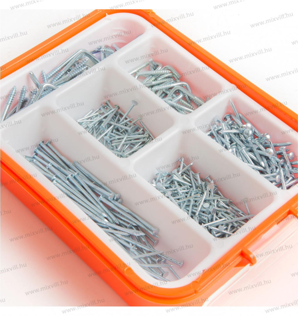 Minden háztartásban szükség van általános barkács termékekre. A szög bármely rögzítési feladat alapkelléke. Használhatja faanyagok egymáshoz illesztéséhez, de kiváló lehet fali képek, óra felfogatására is. Utóbbi feladatokhoz használhatja a szettben található akasztókampókat is. Az átlátszó tetővel rendelkező doboz kiváló áttekinthetőséget biztosít.