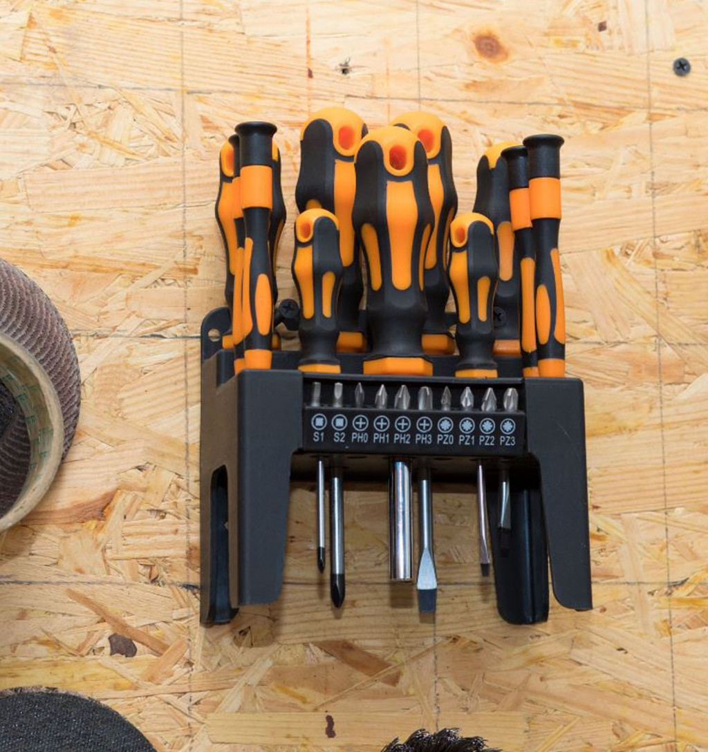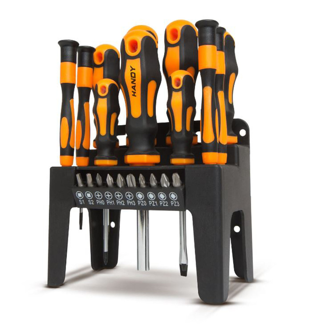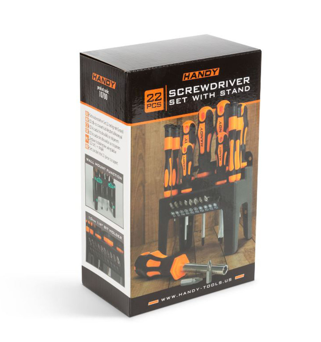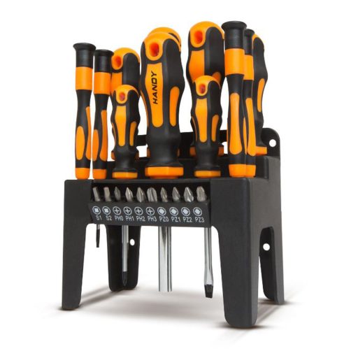 Handy 10700 csavarhúzó készlet, 22 részes, CR-V szárak, ergonomikus markolat, mágneses bitfejek, falra rögzíthető tároló, cikkszám: 10700.