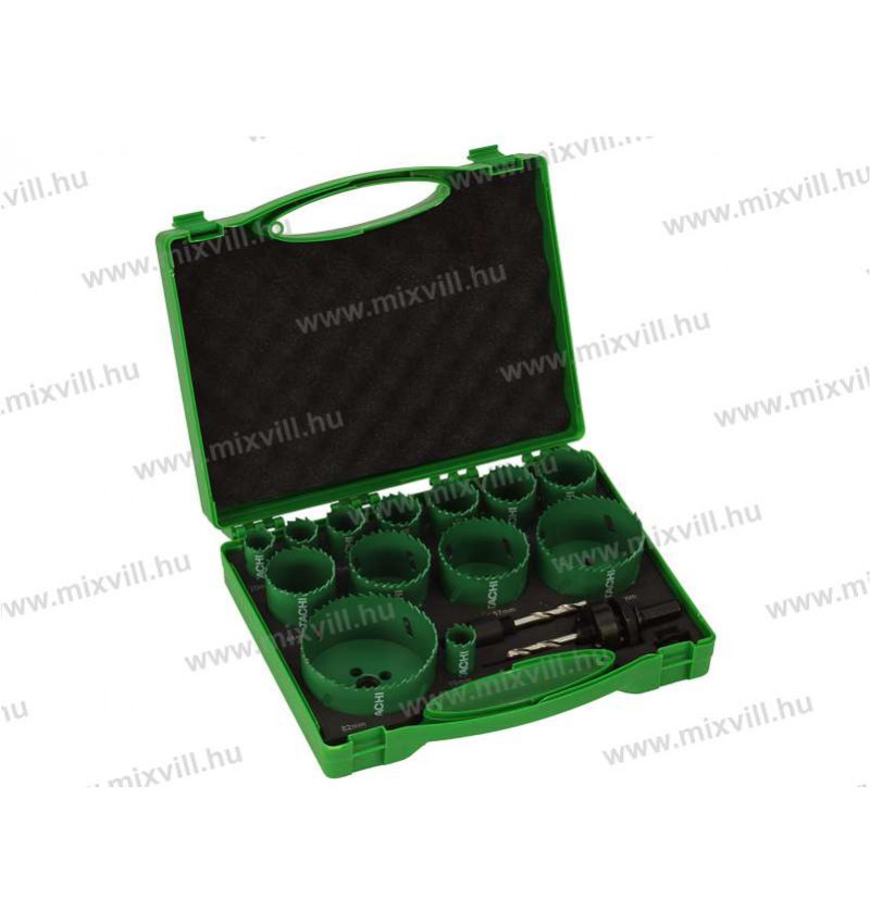 • Tartalma: átm. 19, 20, 22, 25, 29, 32, 35, 38, 44, 51, 57, 68, 82 mm-es fűrészkoronák, 2 db befogószár központfúróval, menetes szűkítő
