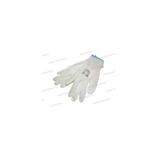 Kötött kesztyű fehér nylon  - Poliuretánba mártott tenyérrésszel és ujjhegyekkel, gumírozott mandzsettával - Egyaránt alkalmas száraz és nedves alkatrészek kezeléséhez.