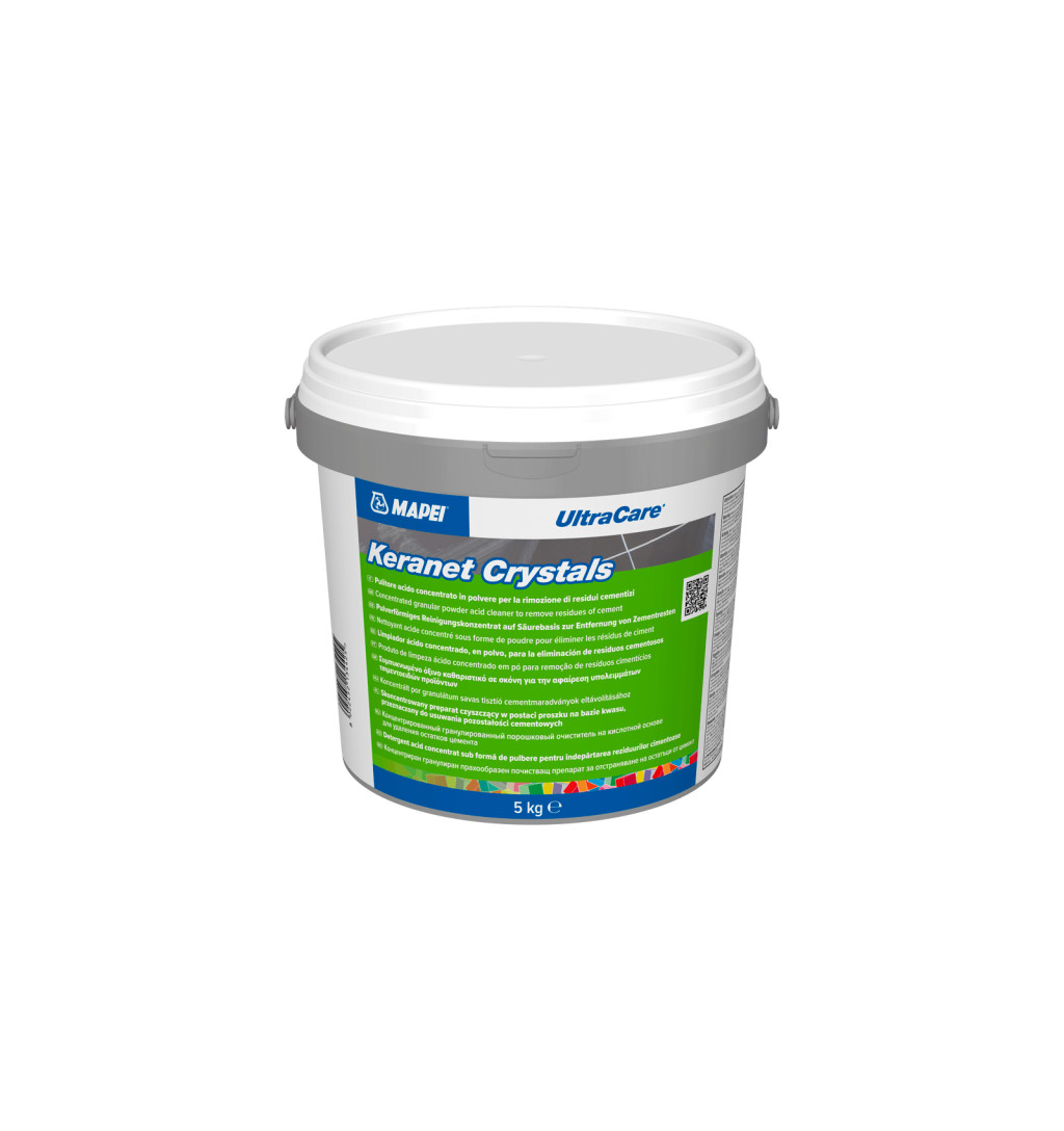 MAPEI Ultracare Keranet Crystals egy por alakú, vízben oldódó, tömény savas tisztítószer, amely hatékonyan eltávolítja a cementkötésű fugázóanyag-maradványokat, a sókivirágzást és a vízkövet saválló burkolatokról. Ideális beépítést követő első tisztításhoz, akár kézzel készített terrakotta lapokon is.
