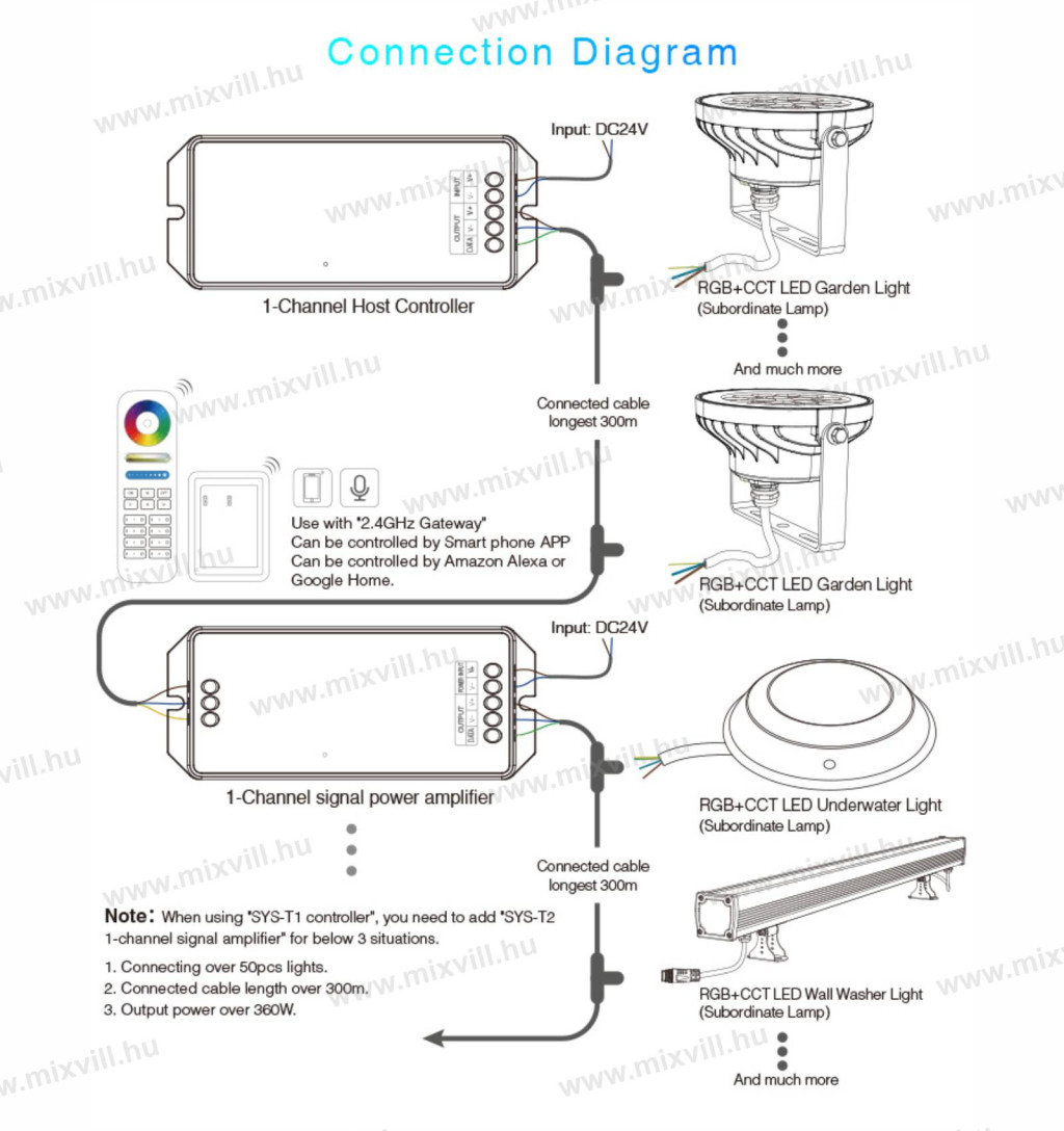 A SYS-PT1 és SYS-T1 buszok mindegyike rendelkezik egy adott terhelhetőséggel a kimeneten, amely további SYS-PT2 és SYS-T2 erősítők használatával bővíthető, bármikor fejleszthetők az ilyen berendezések. Az erősítők előnye a jel további 300 méterrel történő meghosszabbítása is. Mindezt a szabványos MiLight adóeszközök használatával vezérelhetjük. Így az otthoni falpanelünk egyaránt használható beltéri világításra és a felhajtónk, kertünk vagy medencénk megvilágítására, anélkül, hogy további eszközökre lenne szükség. Alternatívaként a létesítményhez WiFi hálózat és az Amazon Alexa vagy a Google Home hangrendszerek segítségével is hozzáférhetünk.