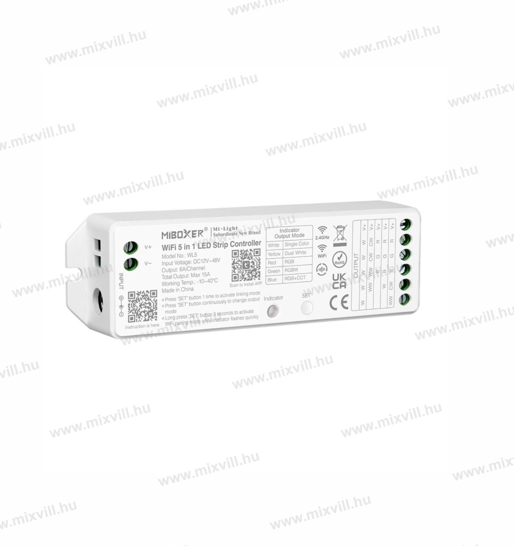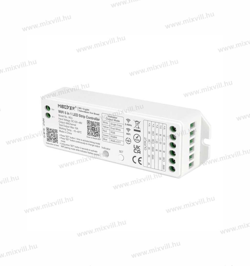 • 5 kimeneti mód váltása egy gombbal (egyszínű / kettős fehér / RGB / RGBW / RGB+CCT)