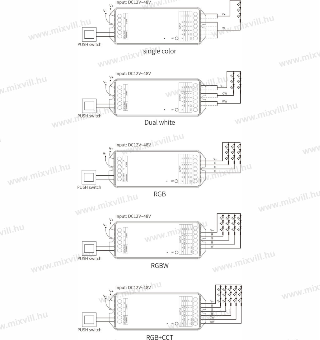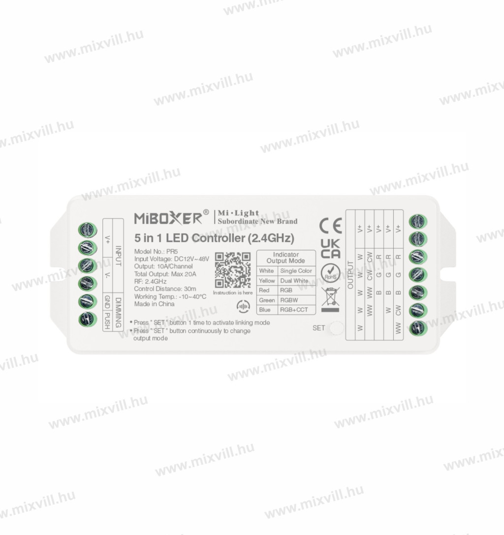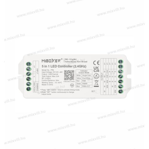MiBoxer Group Control zóna vezérlő 5 az 1-ben DIM+WW/CW/RGB/RGBW/RGB+CCT 10A/ch PR5 A PR5 a széles körben használt 2.4GHz vezeték nélküli technológiát alkalmazza. Vezeték nélküli távirányítóval vezérelhető, okostelefonos vezérléssel és 4G távolsági vezérléssel is (2.4GHz-es átjáró szükséges). vezérlő RGB, fényerő, CCT kimeneti mód. Egy kompatibilis távirányító több vezérlővel egyszerre. Széles körben használják a szállodai világítás és az otthoni világítás vezérlésére.