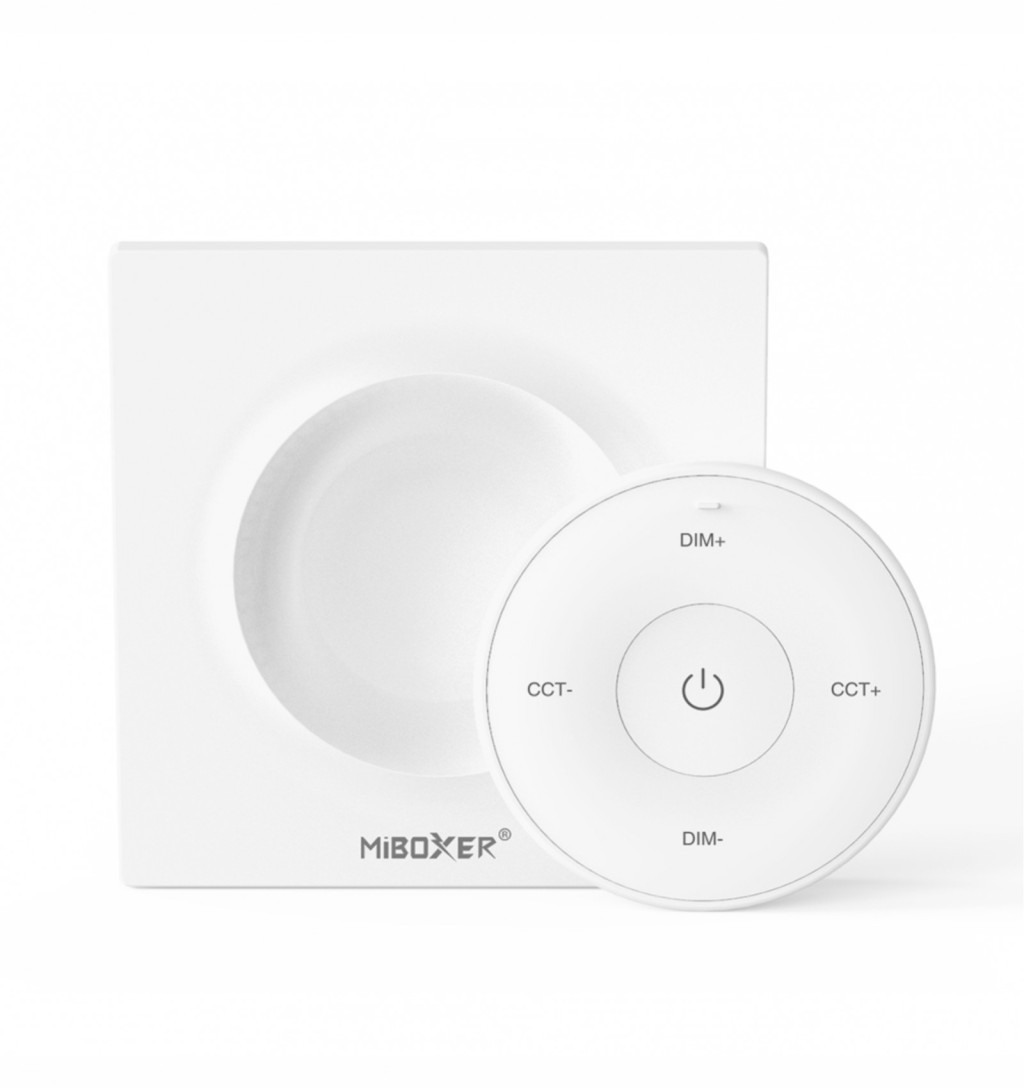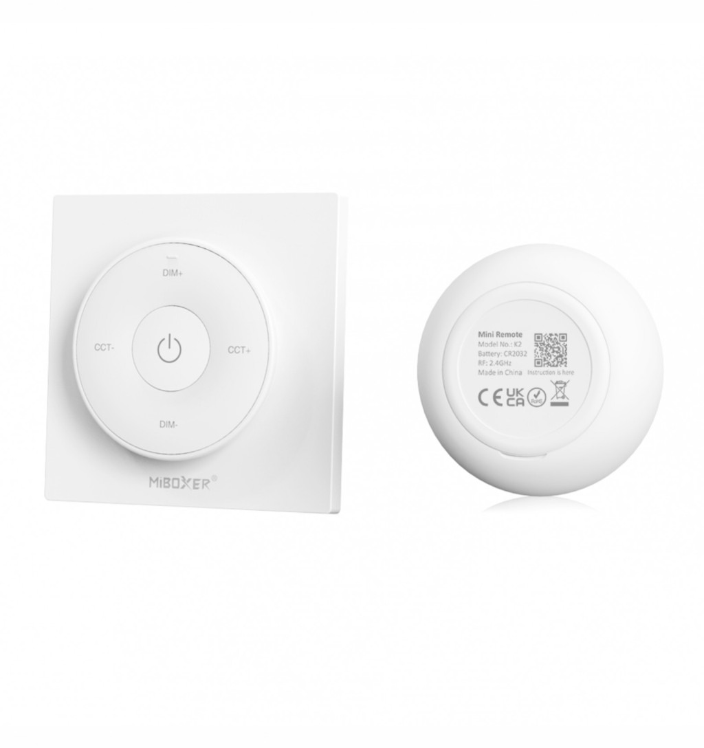 A Miboxer K2 Mini egy 2.4GHz RF vezeték nélküli távirányító, amely kompatibilis a Mi-Light 2.4G sorozatú lámpákkal. Lehetővé teszi a fényerő és színhőmérséklet állítását, akár 30 méteres távolságból. A mágneses tartókonzol segítségével könnyen rögzíthető.