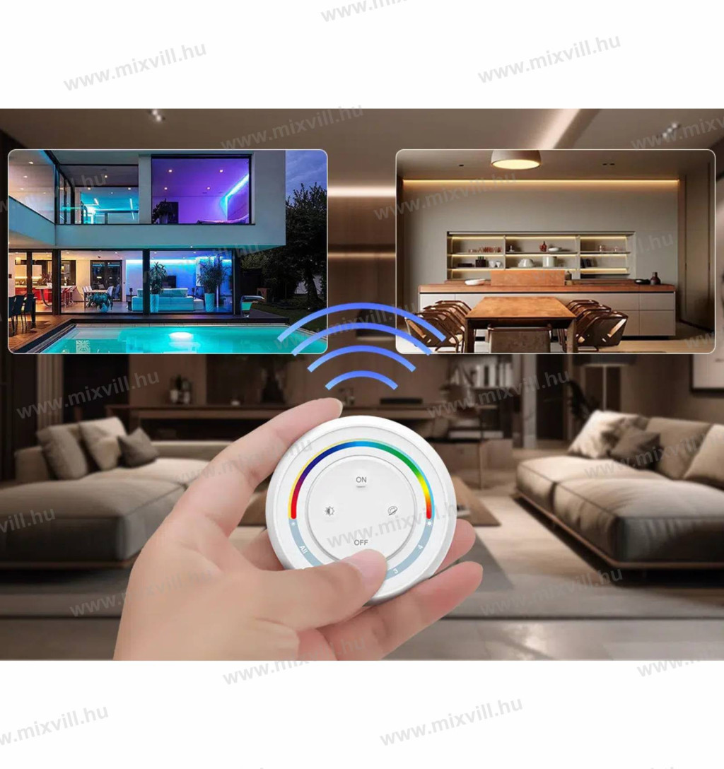 Érintőgyűrű: Fényerő, telítettség, színhőmérséklet, RGB együttes használat. (Alapértelmezés szerint a fényerőt állítja be, ha a távirányítót 3 másodpercig nem működtetik)