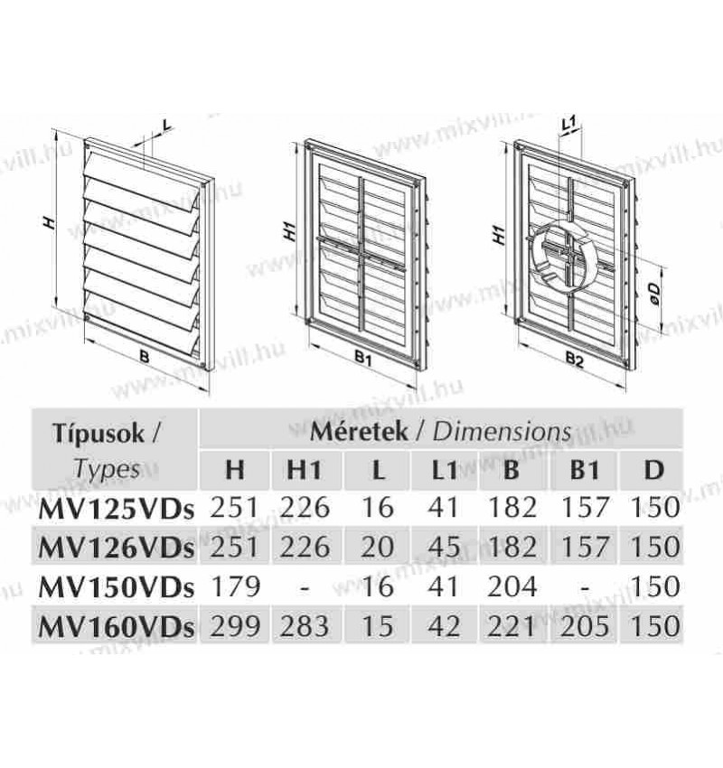 MV 160VDs Szellőzőrács 100-200mm szúnyoghálóval, 220X299mm