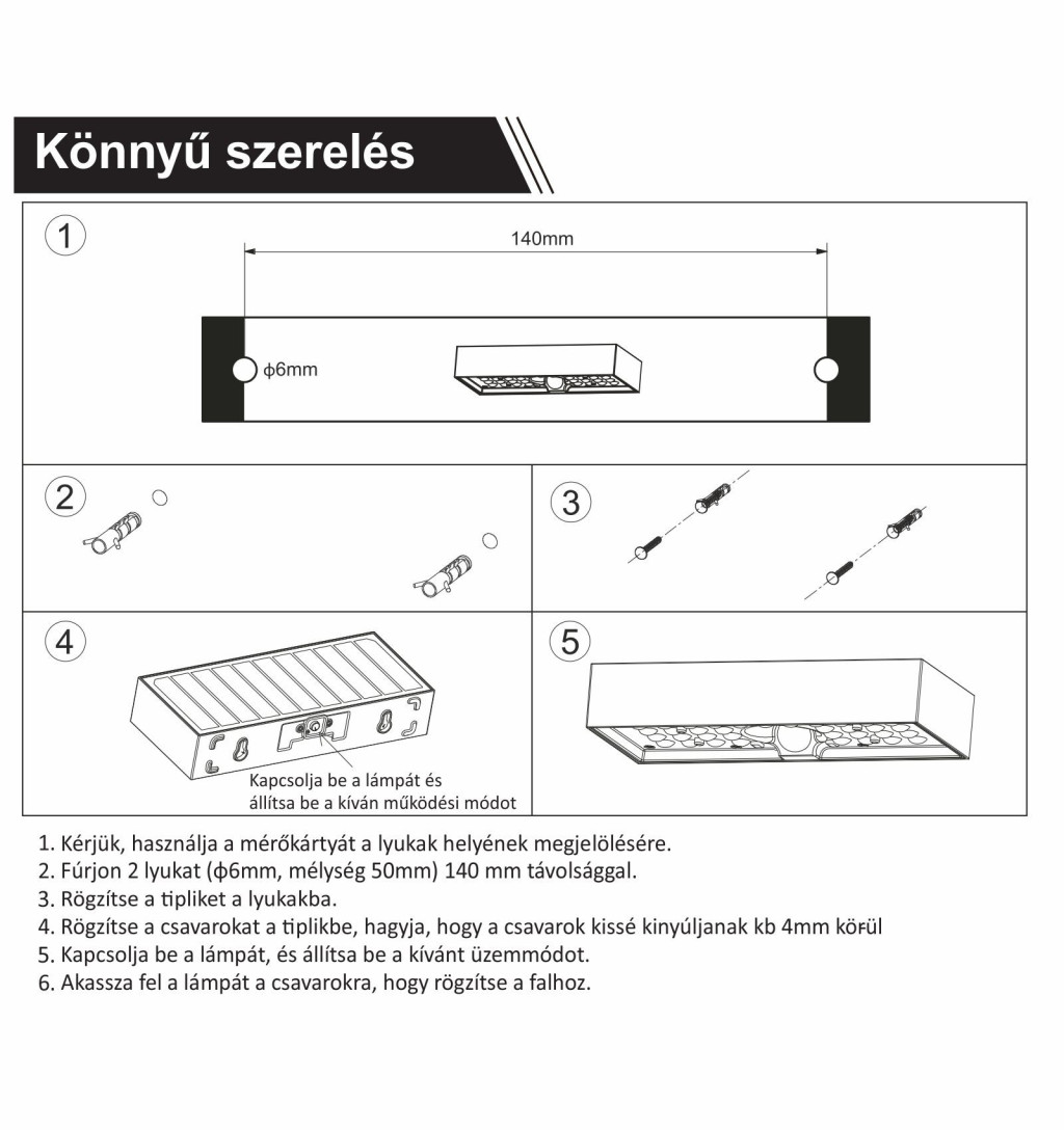 - Csomagolás: 1db napelemes lámpa, 2 db tipli és csavar, 1db mérőkártya szereléshez, 1db felhasználói kéziköny
