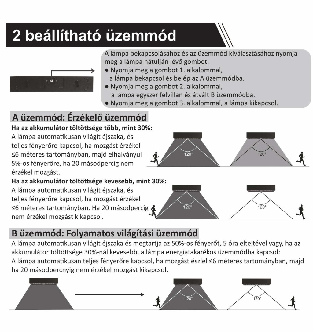- Világítási idő: A módban: 4 éjszaka, B módban 2 éjszaka