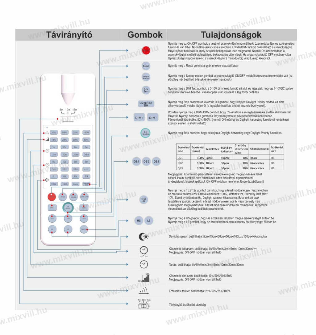 • Be/Ki funkció / 3-lépcsős fényerőszabályzó funkció: az érzékelő 100%-os fényerővel kapcsolja be a fényt, és 10 másodperc elteltével kikapcsol. Az inicializálás során az érzékelő nem képes mozgást érzékelni.