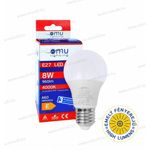 OMU Lighting LED izzó E27 A60 8W 960lm 4000K természetes fehér emelt fényerejű garancia 3 év LBE27A608.09604000
