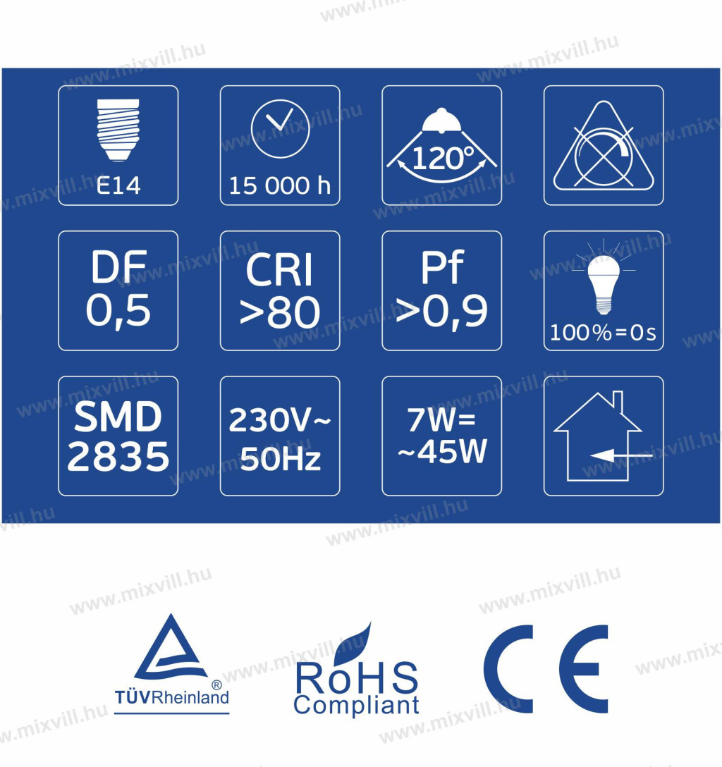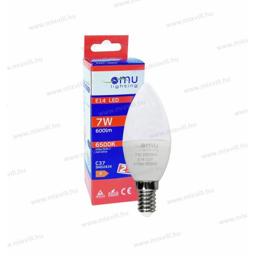 OMU Lighting LED izzó E14 C37 gyertya 7W 600lm 6500K hideg fehér garancia 2 év LBE14C377.06006500