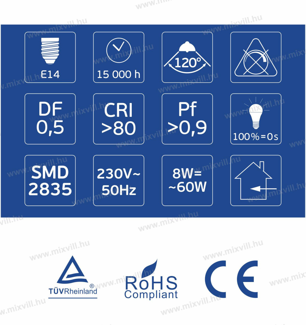 OMU Lighting LED izzó E14 C37 gyertya 8W 806lm 6500K hideg fehér garancia 2 év LBE14C378.08066500