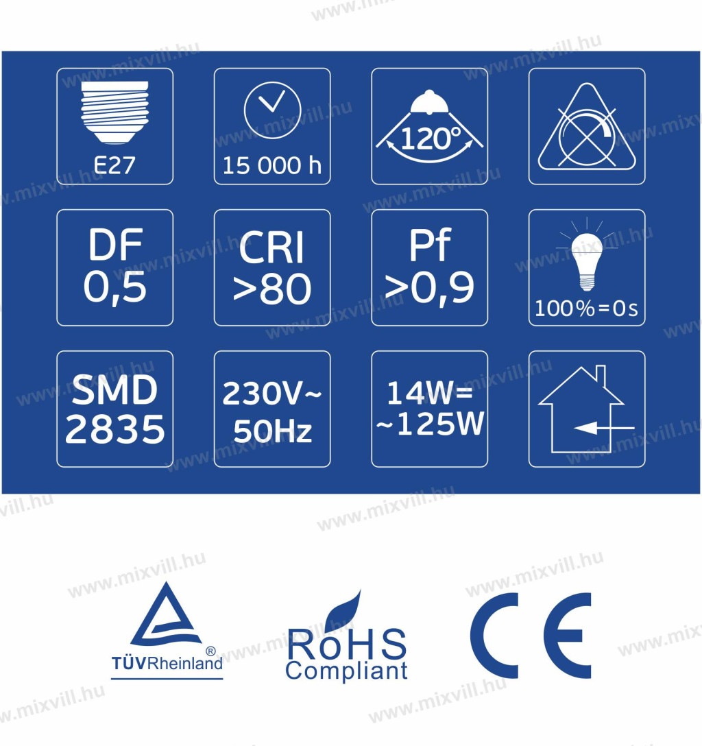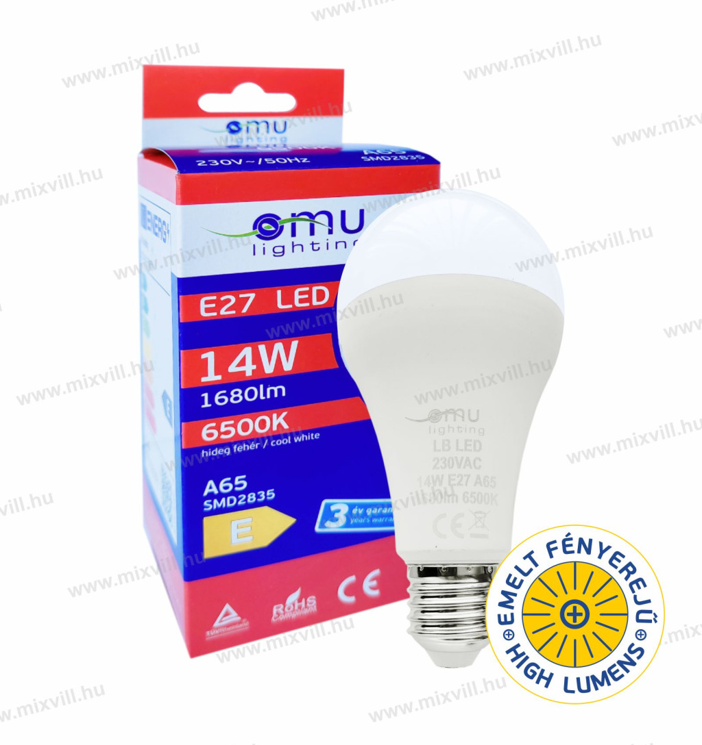 OMU Lighting LED izzó E27 A65 14W 1680lm 6500K hideg fehér garancia 3 év LBE27A651416806500