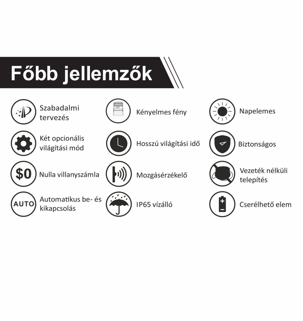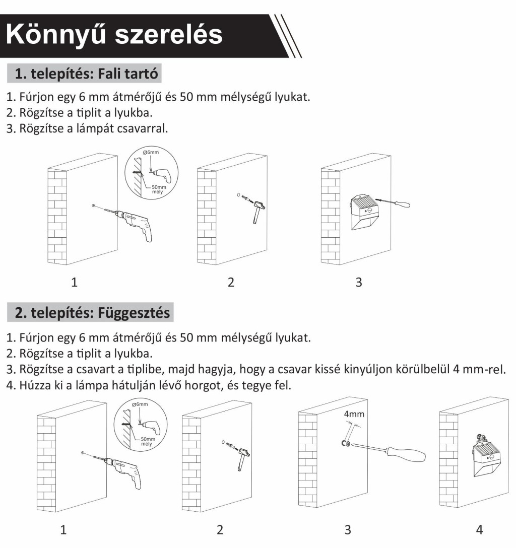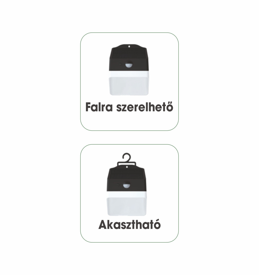 - Csomag tartalma: 1db Napelemes lámpa, 2db tipli és csavar, 1db Felhasználói kézikönyv