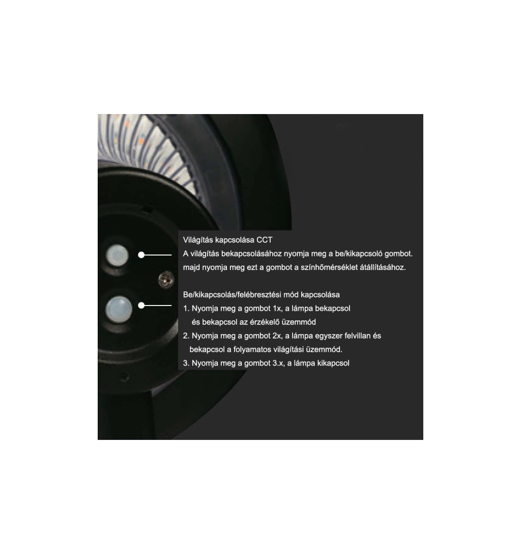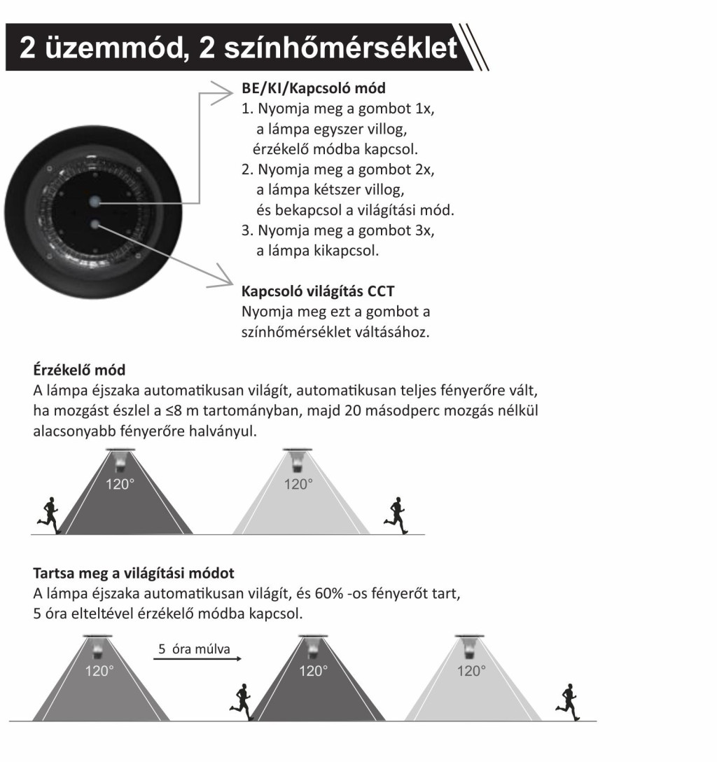 - Időzített üzemmód: A lámpa az első 5 órában teljes fényerőn működik, majd automatikusan átvált érzékelő üzemmódba, így energiát takarít meg.