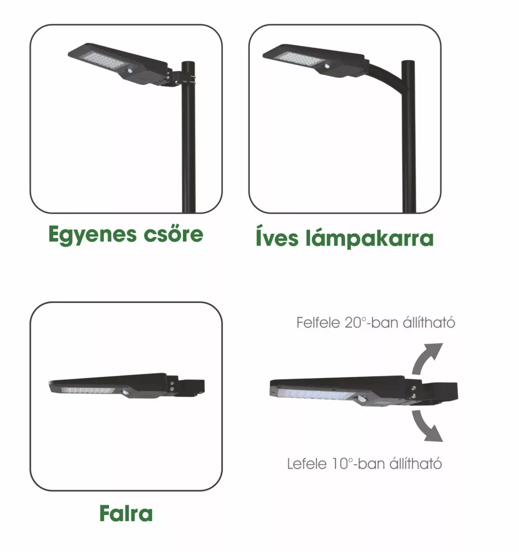 3 különböző telepítési lehetőség: A lámpa rugalmas telepítési lehetőségeket kínál, így falra, oszlopra vagy más felületekre könnyen felszerelhető, hogy a legmegfelelőbb pozícióban legyen a világítás.