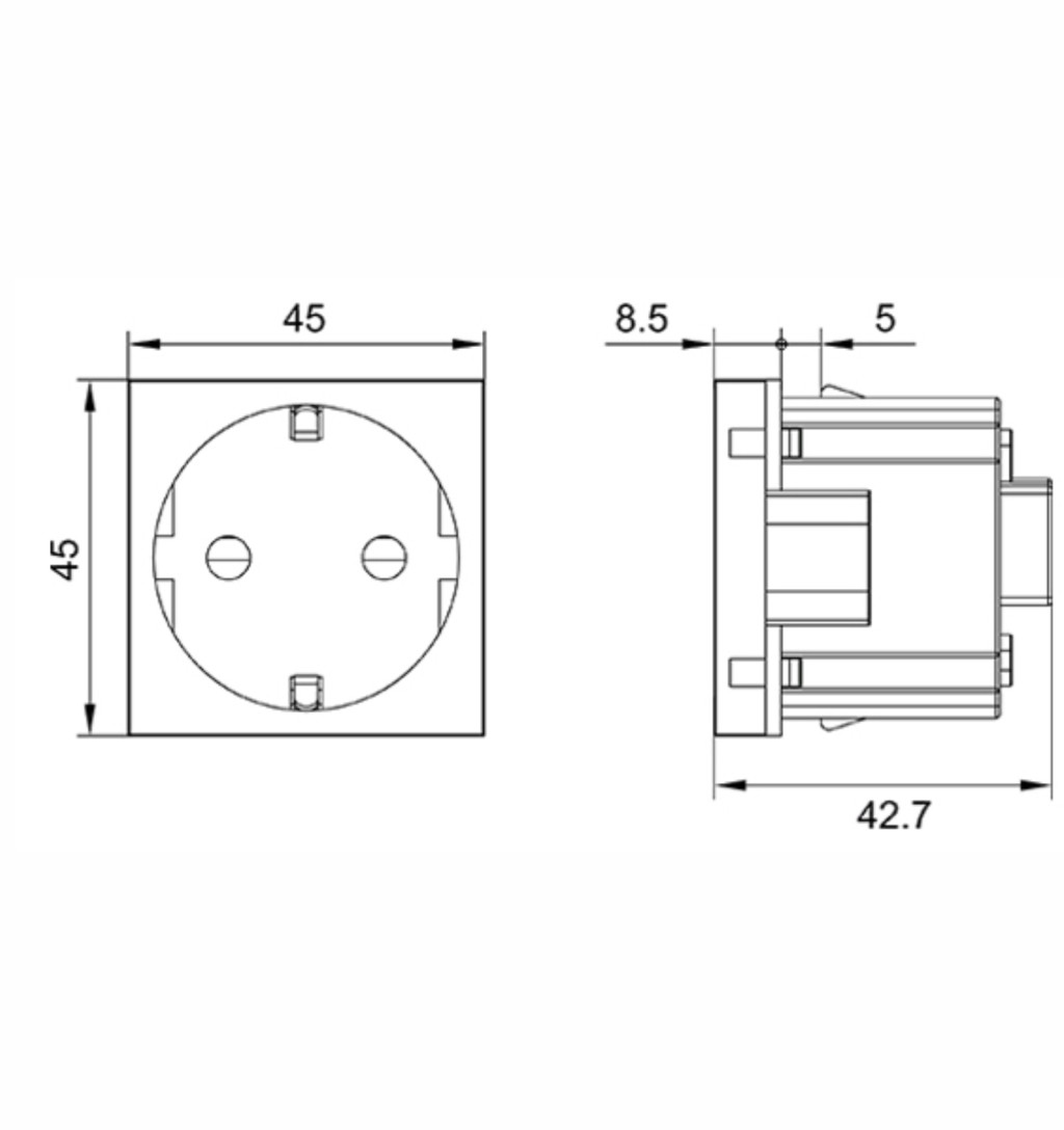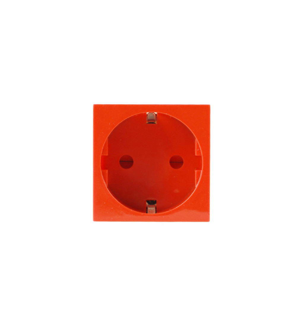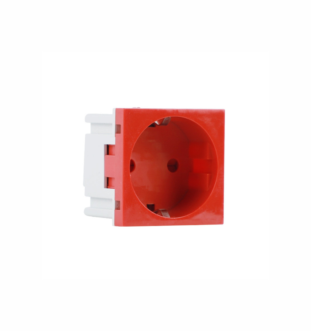 A KM45-DS12R egy moduláris 2+F típusú Schuko dugalj, amely 45x45 mm-es méretével ideális választás 45°-os szerelvényezésre alkalmas műanyag csatornarendszerekhez. A piros szín külön jelölésre vagy azonosításra is kiváló.