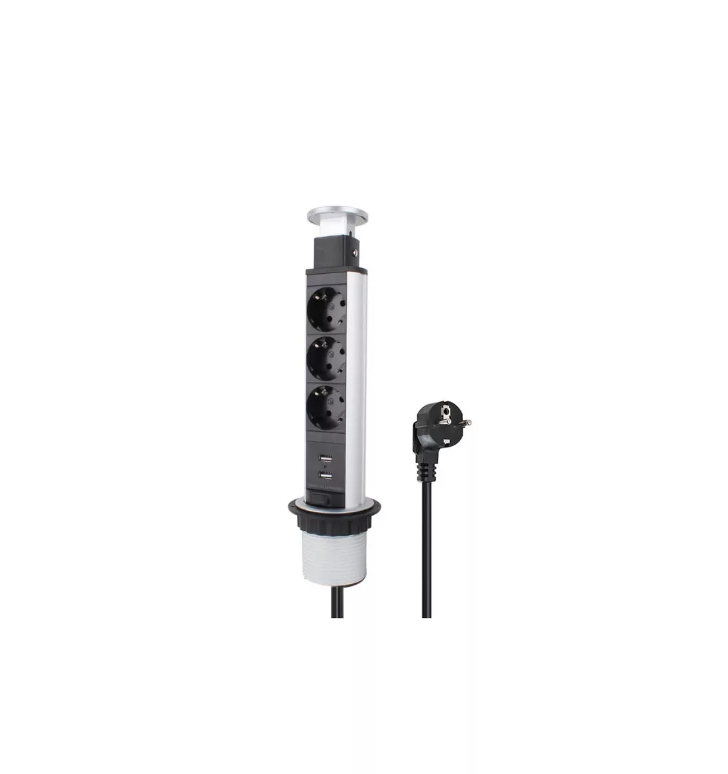 OMU system POP7 3G2U bútorba építhető, kihúzható rejtett elosztó, 3x2+F schucko ezüst 2xUSB 220-240VAC 16A 1,8m kábel