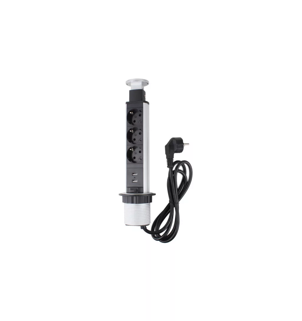 A bútorlapba építhető, előugró rejtewtt elosztók kiváló minőségű alumíniumból és műanyagból készülnek, biztonságosak és tartósak. Csavarhurokkal rendelkezik, amely könnyen felcsavarható a panel hátuljára. Az alja átcsúszik a munkalapon, majd van egy műanyag rész, amely alulról csavarodik és a pultra nyomódik.