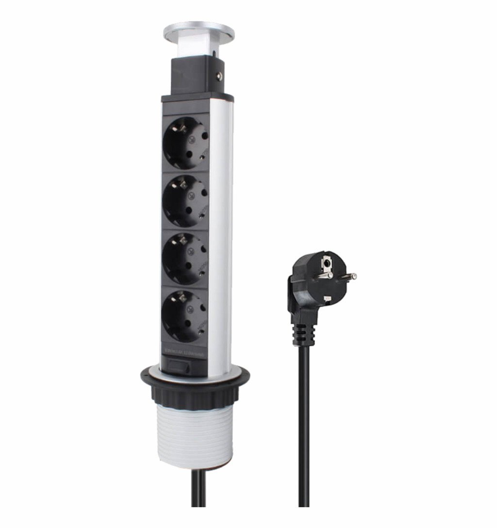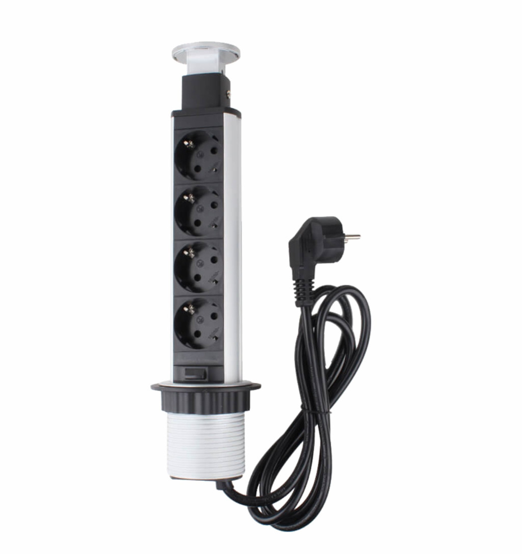 A bútorlapba építhető, előugró rejtett elosztók kiváló minőségű alumíniumból és műanyagból készülnek, biztonságosak és tartósak. Csavarhurokkal rendelkezik, amely könnyen felcsavarható a panel hátuljára. Az alja átcsúszik a munkalapon, majd van egy műanyag rész, amely alulról csavarodik és a pultra nyomódik.