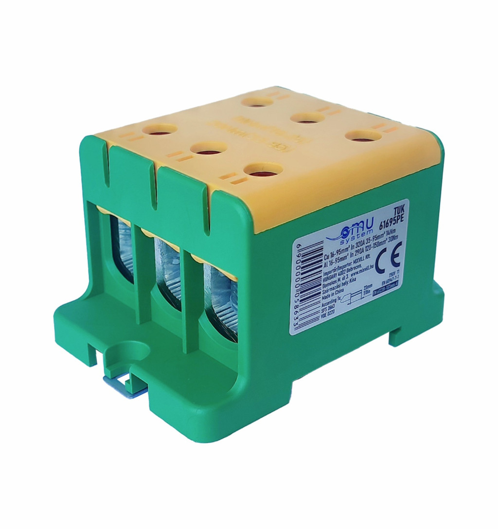 Omu system TUK61695PE 6x16-95mm2 (CU:320A, AL:290A) 1 pólus, zöld-sárga csatlakozókapocs, univerzális sorkapocs