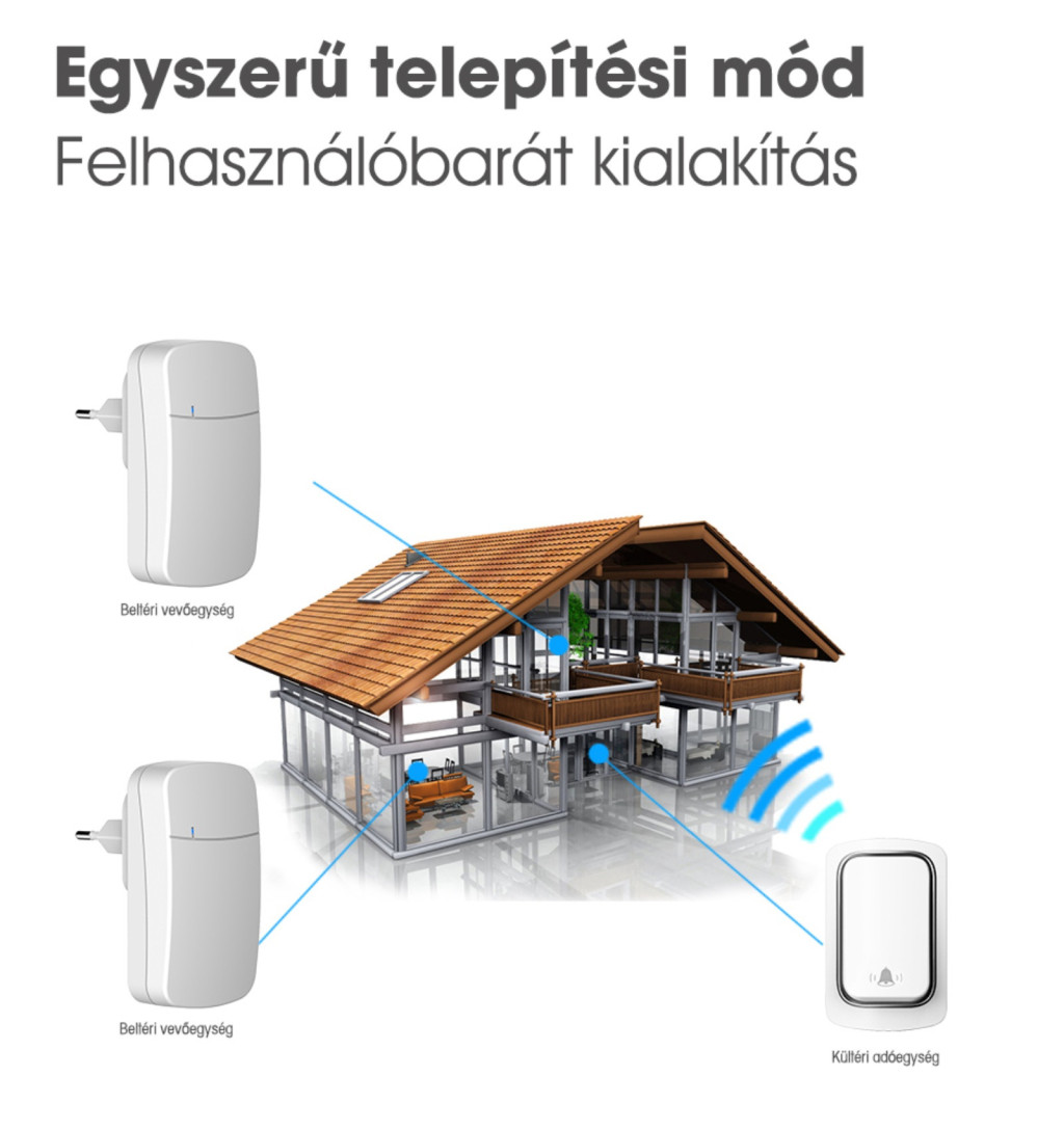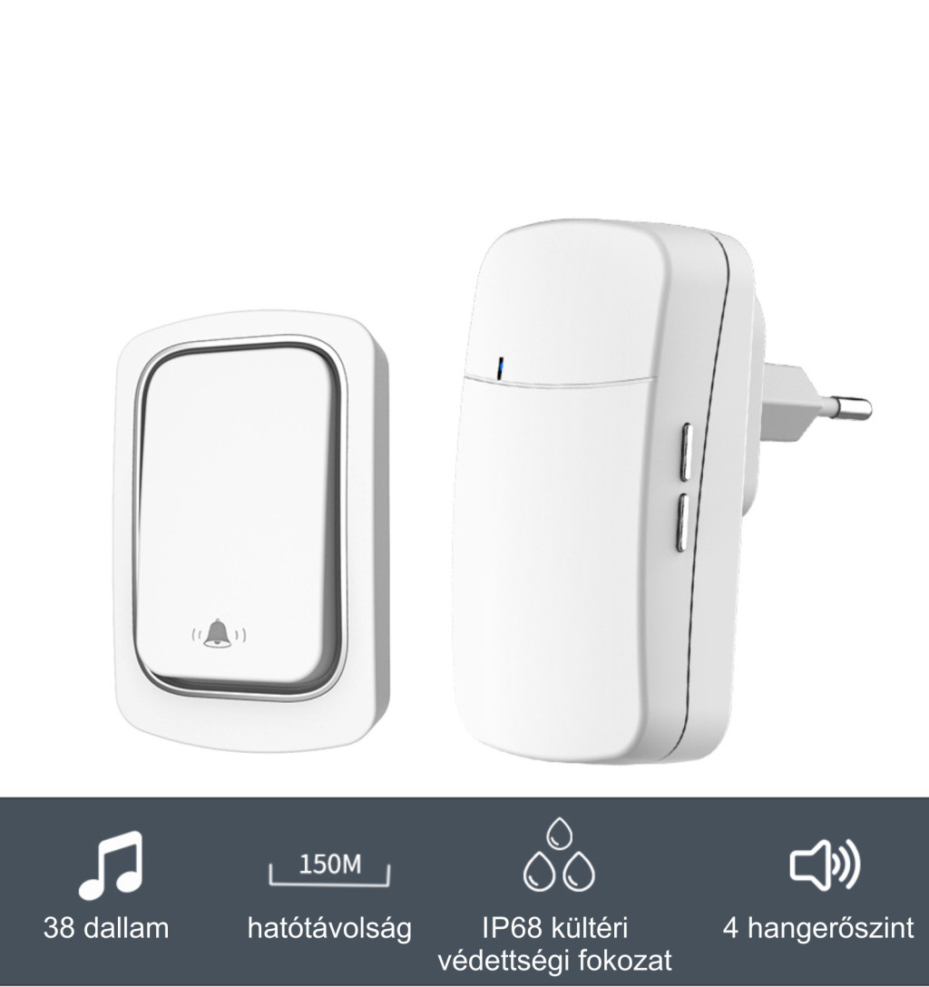 Elem nélküli működés: A KINETIC technológia lehetővé teszi, hogy az adó elem nélkül működjön, így soha nem kell elemet cserélni. Egyszerű telepítés: Könnyen rögzíthető kétoldalas ragasztóval vagy csavarokkal a kívánt helyre. Nagy hatótávolság: Akár 150 méteres vezeték nélküli hatótávolság szabad területen. Univerzális használat: Ideális otthonokba, irodákba, üzletekbe és raktárakba. Elegáns és praktikus: Kompakt kialakítás, amely illeszkedik bármilyen környezethez. Műszaki paraméterek: Vevő üzemi feszültsége: AC100-240V, 50Hz/60Hz Vevő energiafogyasztása: 0,2W Működési frekvencia: 433MHz Csengőhangerő: >50dB (0,5 méteren mérve) Méretek: Adó: 50x80x28mm; Vevő: 53x95x49-70mm Üzemi hőmérséklet: Adó: -20°C...+60°C; Vevő: -10°C...+45°C Fontos megjegyzések Ne telepítse fémtárgyak, például vasajtók és vaskeretek közelében, mivel ezek befolyásolhatják az átviteli távolságot. A falak és a mennyezet csökkenthetik a hatótávolságot. A csengő akár 3-4 falon is képes áthatolni. Ideális választás nagyobb házakhoz és irodákhoz