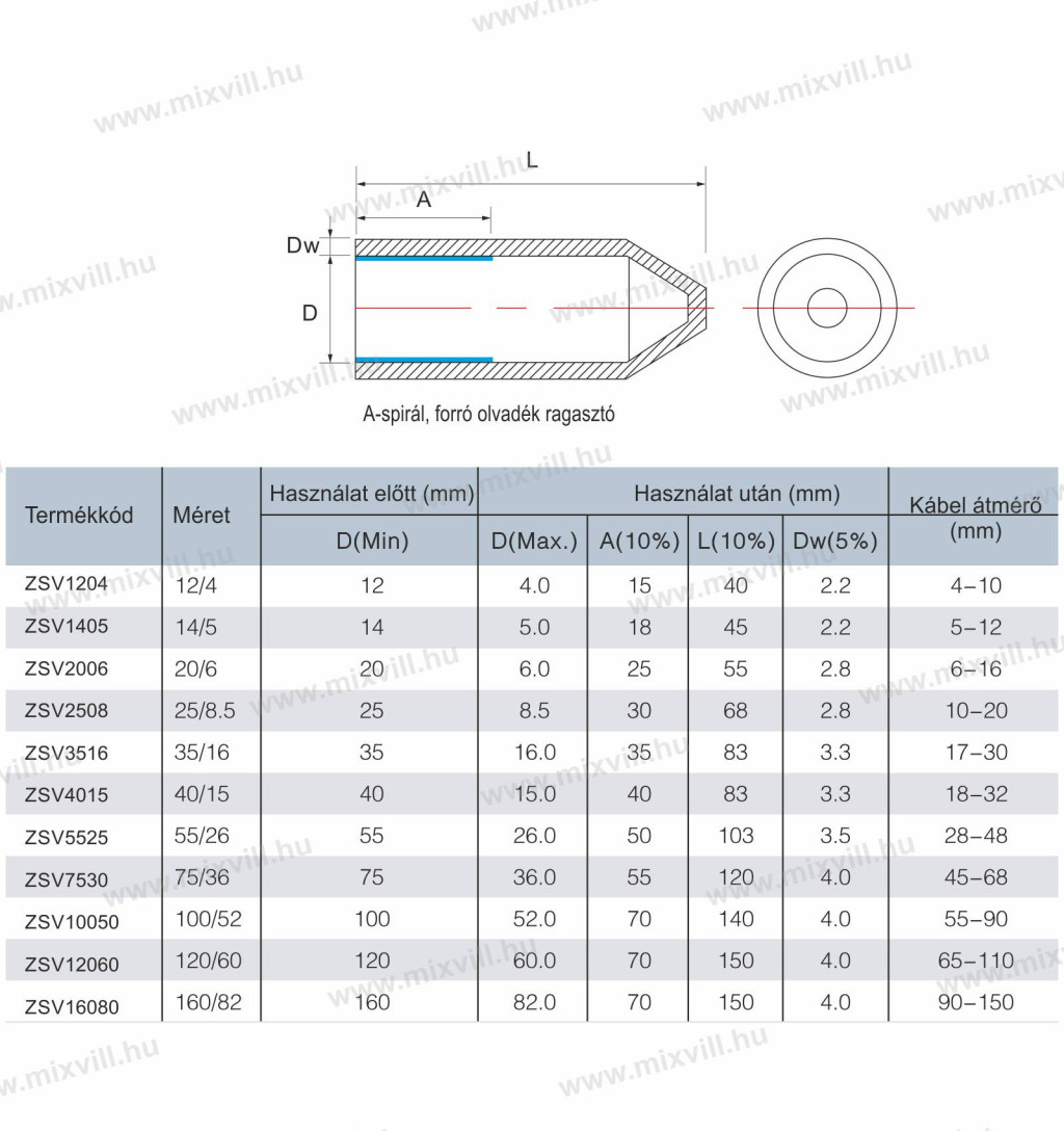 A ZSV zsugor kábel zárósapka gazdaságos megoldást kínál a tápkábel végének teljesen vízzáró lezárására. A végzáró sapka belső felülete spirál kialakítású, alamint forróolvadék-ragasztóval ellátott réteggel rendelkezik. A alkalmazása mind a szabadban, mind a PVC-vel ellátott földalatti áramelosztó kábeleken ajánlott.