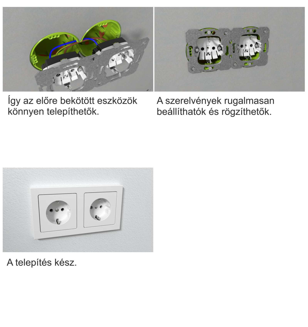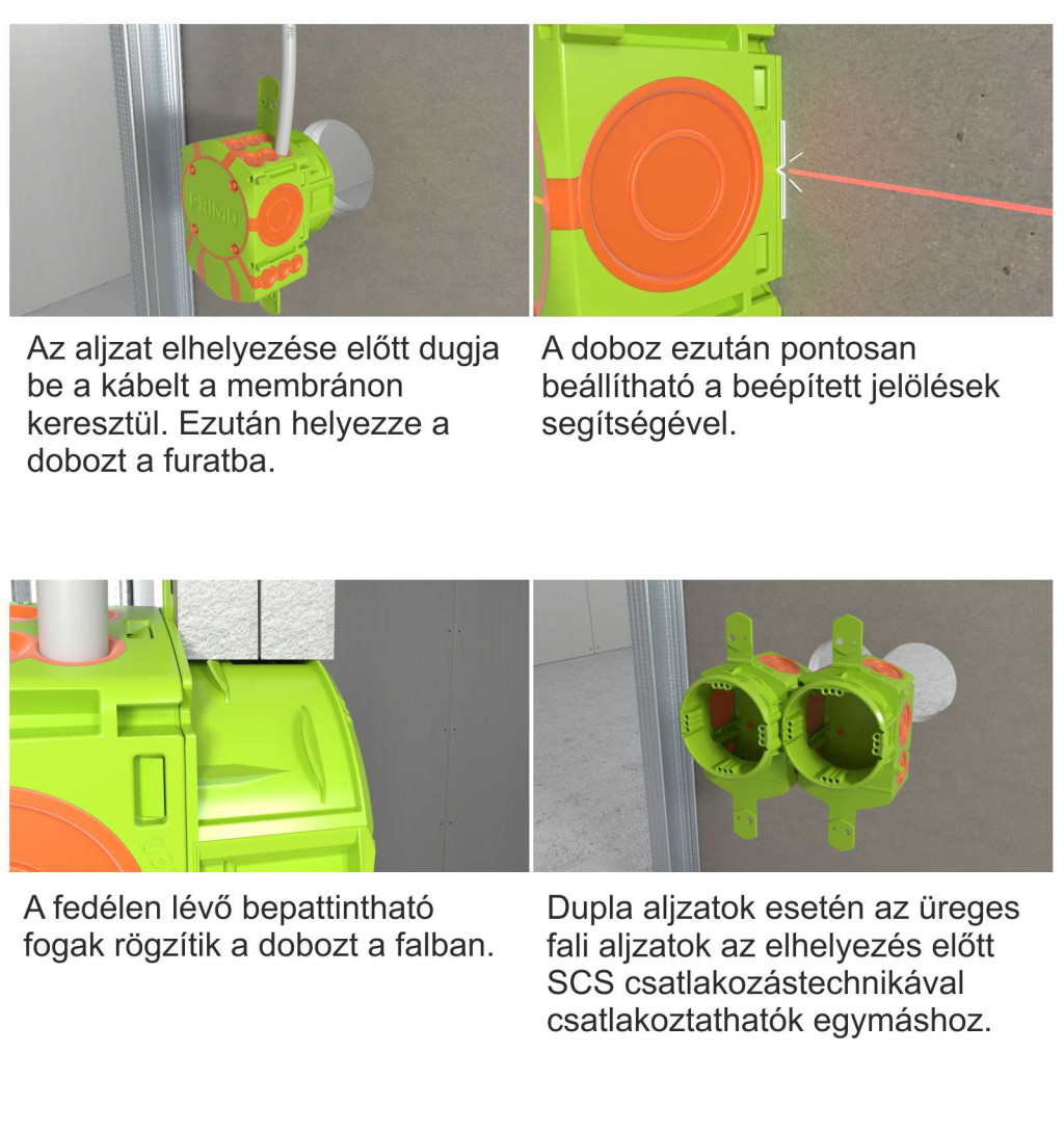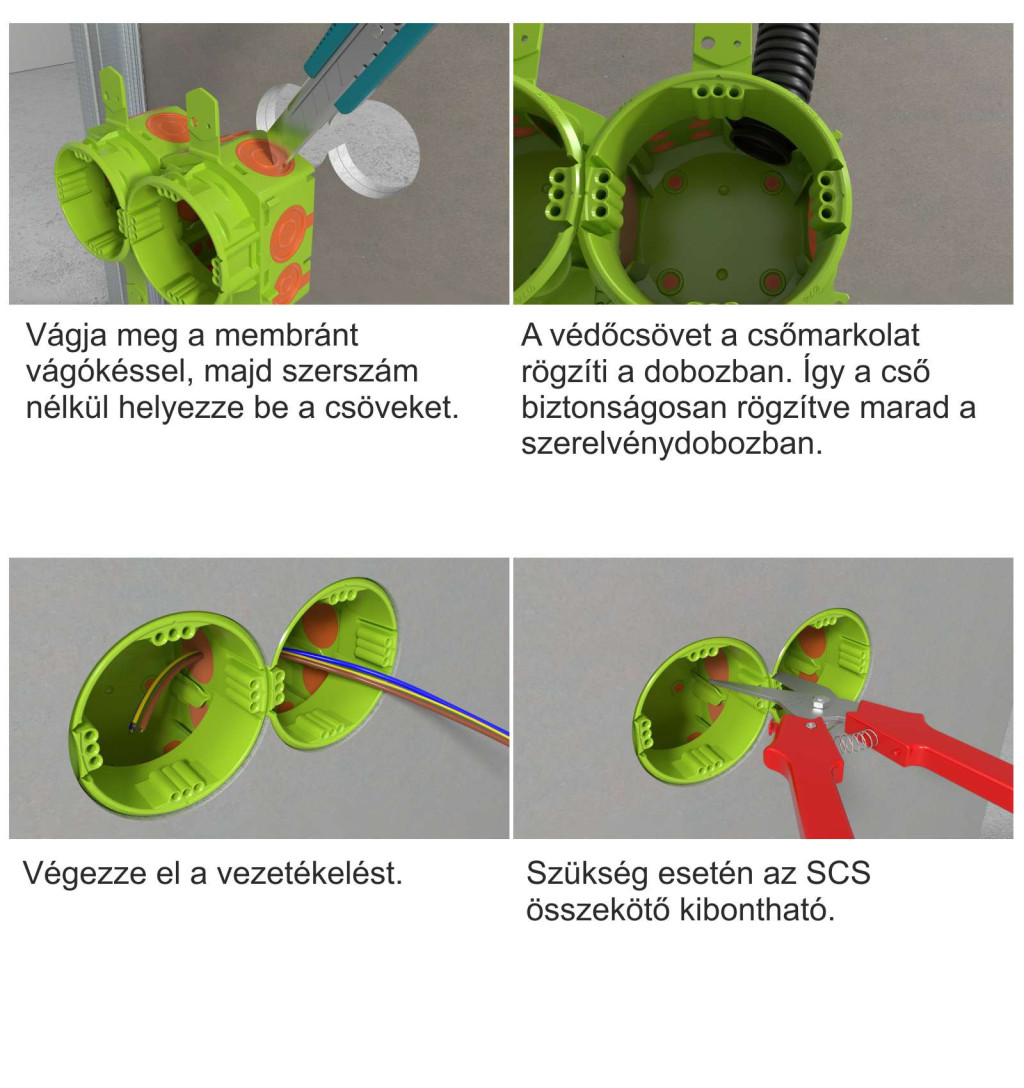 - Egyszerű és gyors telepítés: SCS technológiás (membrán) vezetékbevezetés, csavartüskés stabil rögzítés minden oldalról.