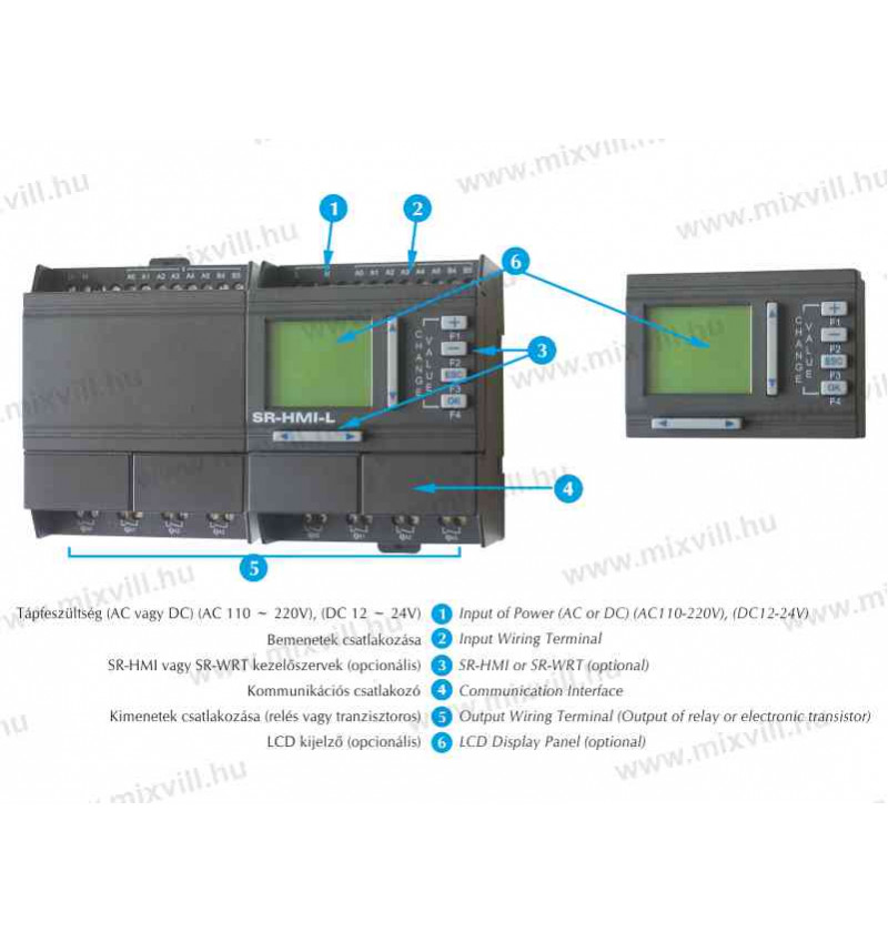 Kiegészítő modulokkal (9SR-20ERA, SR-20ERD SR-20ETD vagy SR-20EGD) megnövelhető a bemenetek és a kimenetek száma. Egy főmodulhoz 5 bővítő modul csatlakoztatható, így maximálisan 122 I/O csatlakozási pont érhető el. (74 bemenet és 48 kimenet). Az SR vezérlőmodul alkalmazható távoli és helyi vezérlések megvalósítására, távfelügyeleti rendszerek kialakítására. Széles körben alkalmazható az ipar, a közlekedés, a kereskedelem, bányászat, mezőgazdaság és az épület automatizálás területén.