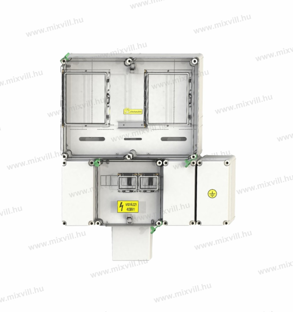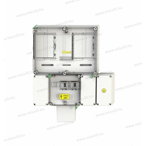 Egy felhasználási helyes M63.80A és V32A mérés földkábeles, felületre szerelt kivitelben, FBD kábel bevezetővel, mért oldalon PVT 1530 FF fő földelő sínnel, 2db PVT 1530 FSK fogyasztói elosztóval