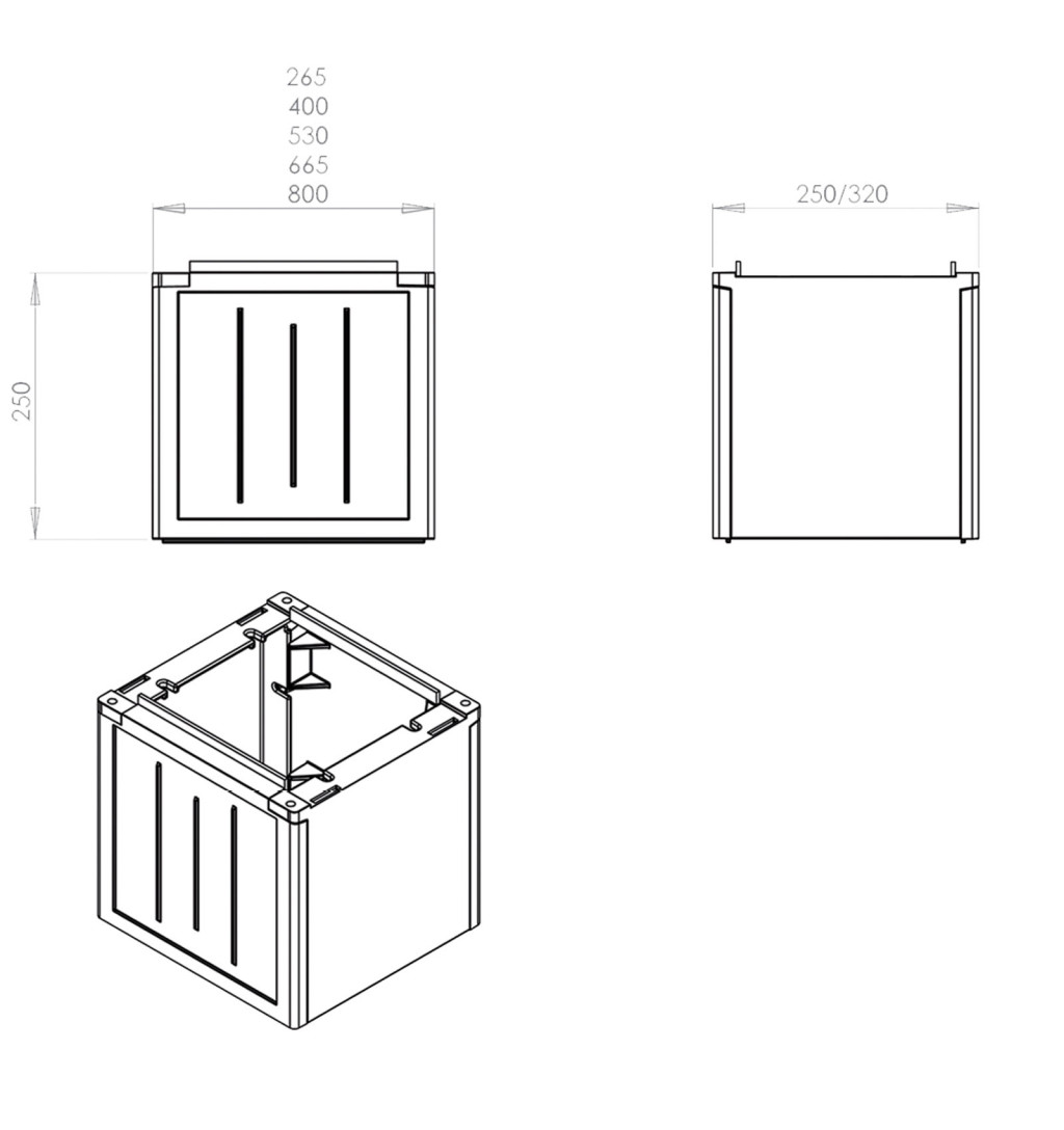 A 660 × 250 × 250 mm méretű magasító alkalmas villanyszerelési rendszerek, elosztószekrények vagy egyéb kültéri kábelcsatlakozások kialakításához. A szürke kivitel diszkrét megjelenést biztosít különböző telepítési környezetekben.