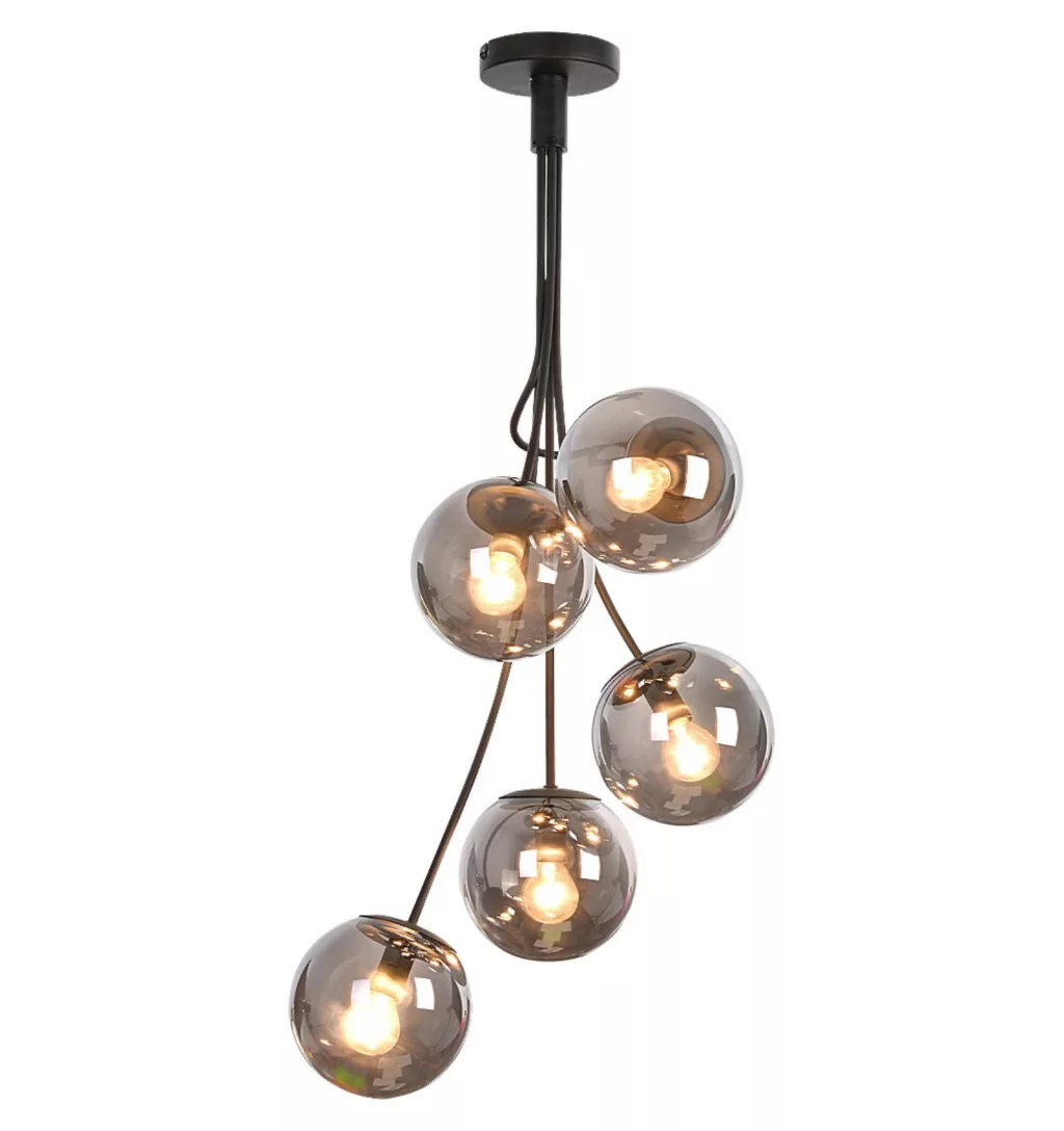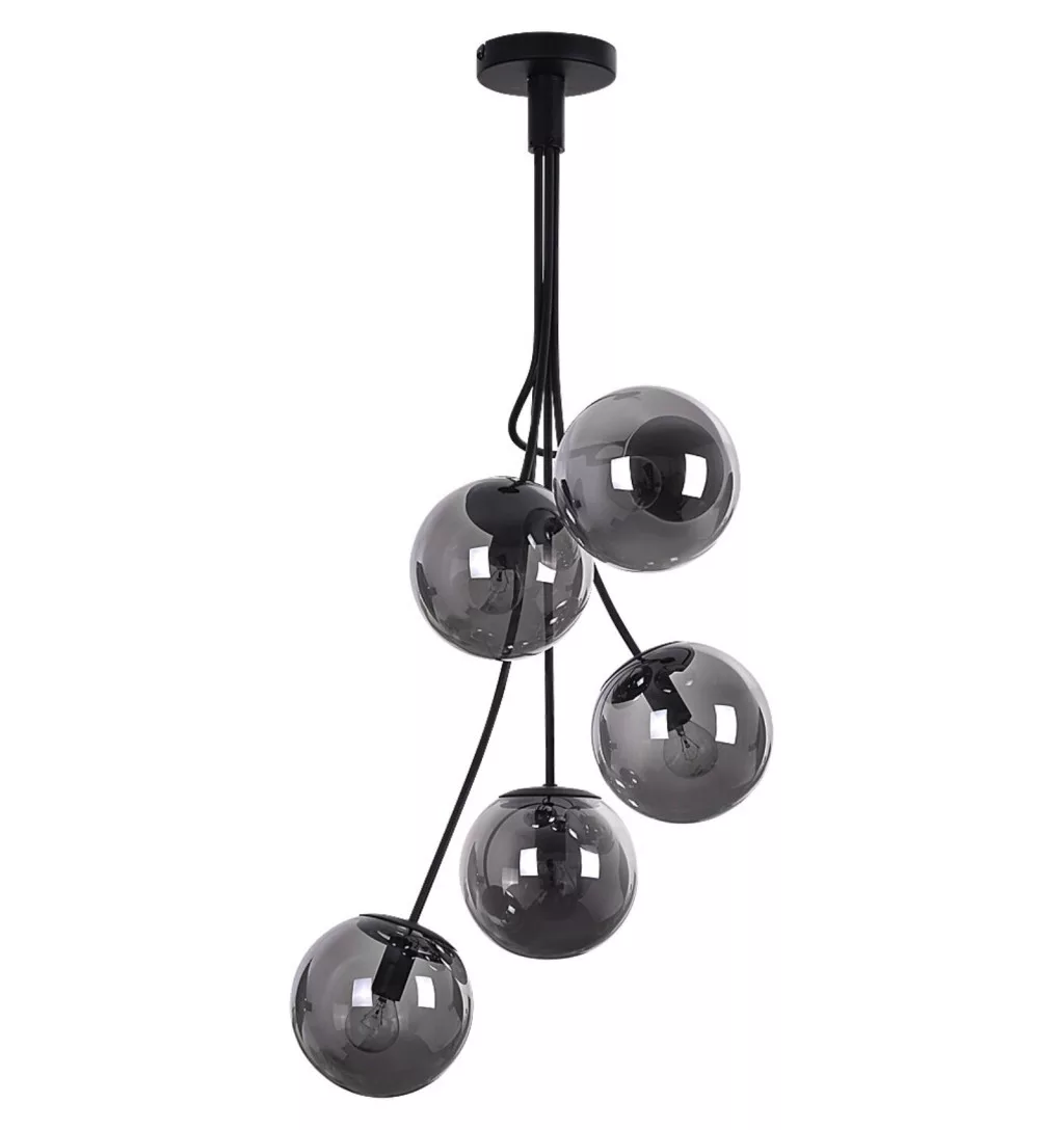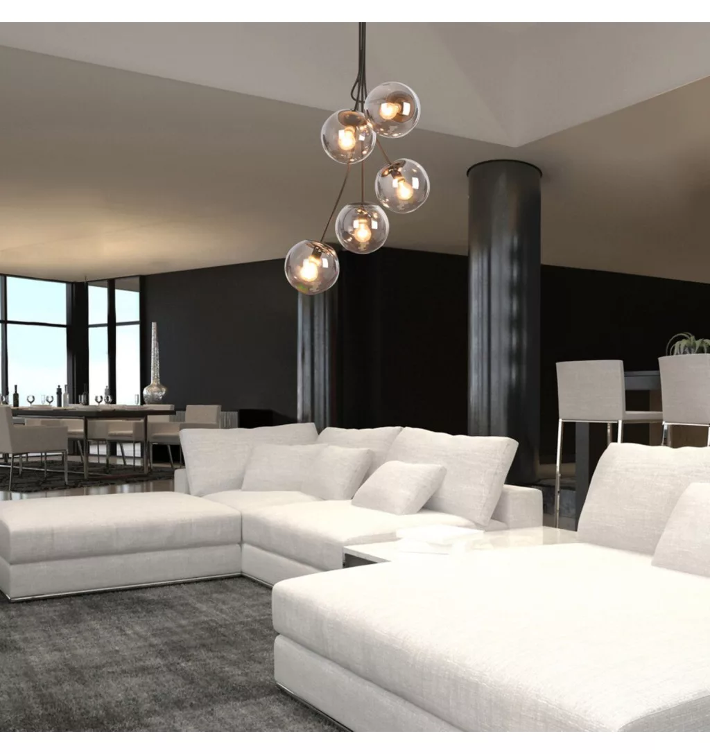 A Glory ötös függeszték modern és elegáns megjelenésével különleges hangulatot teremt a nappaliban vagy az étkezőben. Dizájnja egy légiesen lebegő fénycsokorra emlékeztet, amely egyedi karaktert kölcsönöz a térnek. A matt fekete, fémből készült, több irányba ágazó lámpatestet gömb alakú, színezett üvegbúrák és egy kerek dísztalp egészíti ki, harmonikus összhatást teremtve.