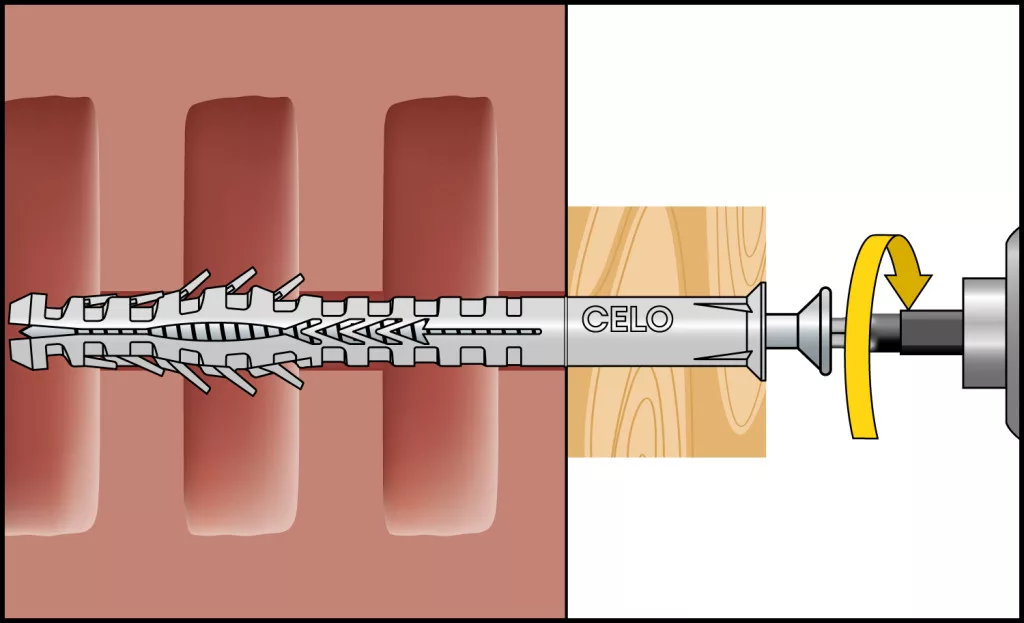 A CELO HBR nagy telepítési mélységével ideális üreges falazatokhoz. A hosszú felületen történő nagy tágulási képességének köszönhetően nagy terhelhetőségű. Az elülső részen elhelyezkedő 10 db szárny meggátolja az elforgását a furatban.