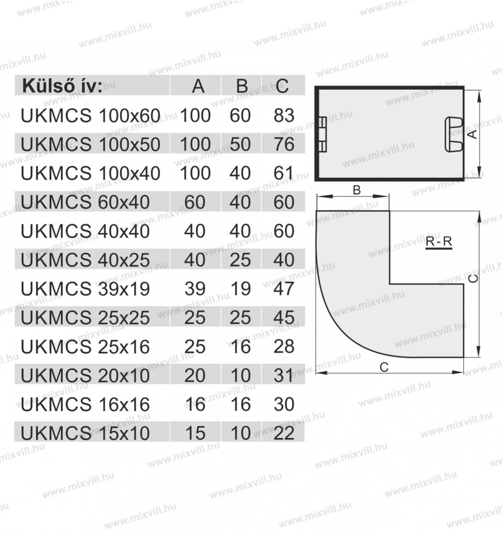Az UKMCS kábelcsatorna külső ívek jellemzői: