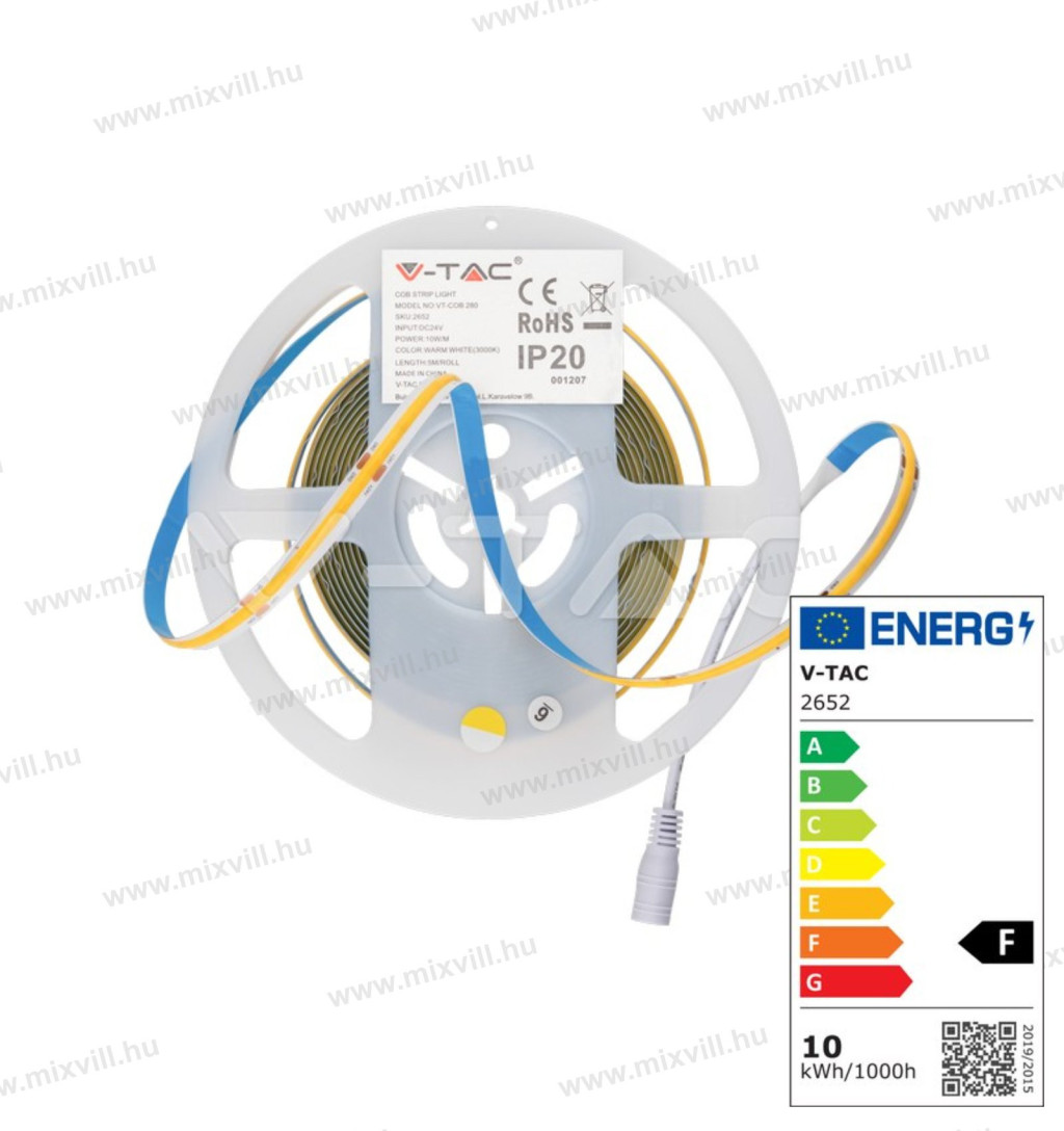 V-TAC SKU-2652 Led szalag IP20 COB 10W/m 800lm/m 3000K 24V DC 8mm 5m