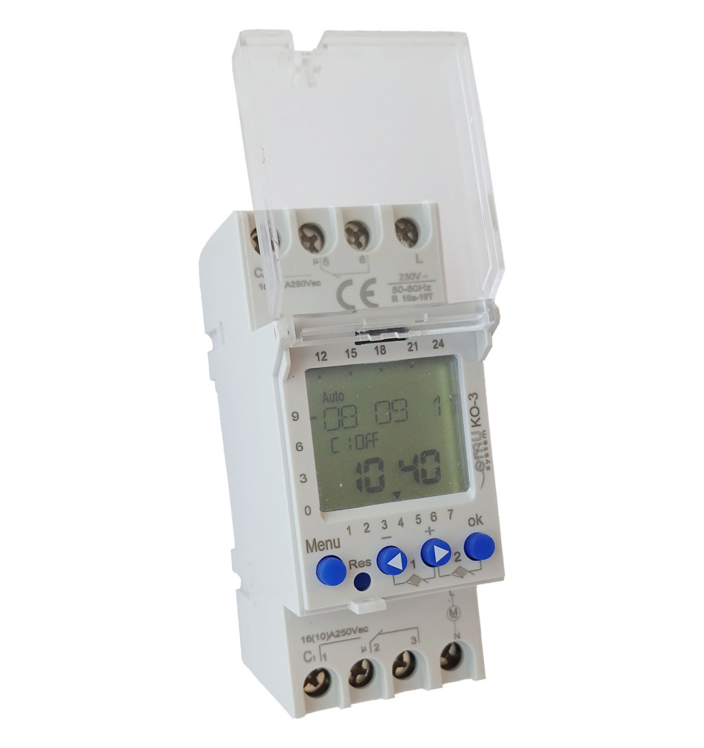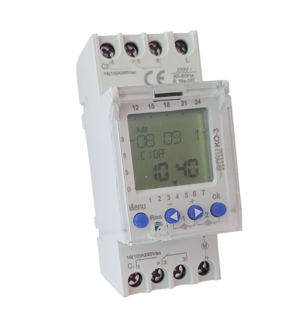 A KO-3 digitális kapcsolóóra megbízható és precíz időzített vezérlést biztosít világítási és egyéb elektromos rendszerek számára. A kétcsatornás kialakítás lehetővé teszi két külön áramkör független vezérlését napi vagy heti programozással.